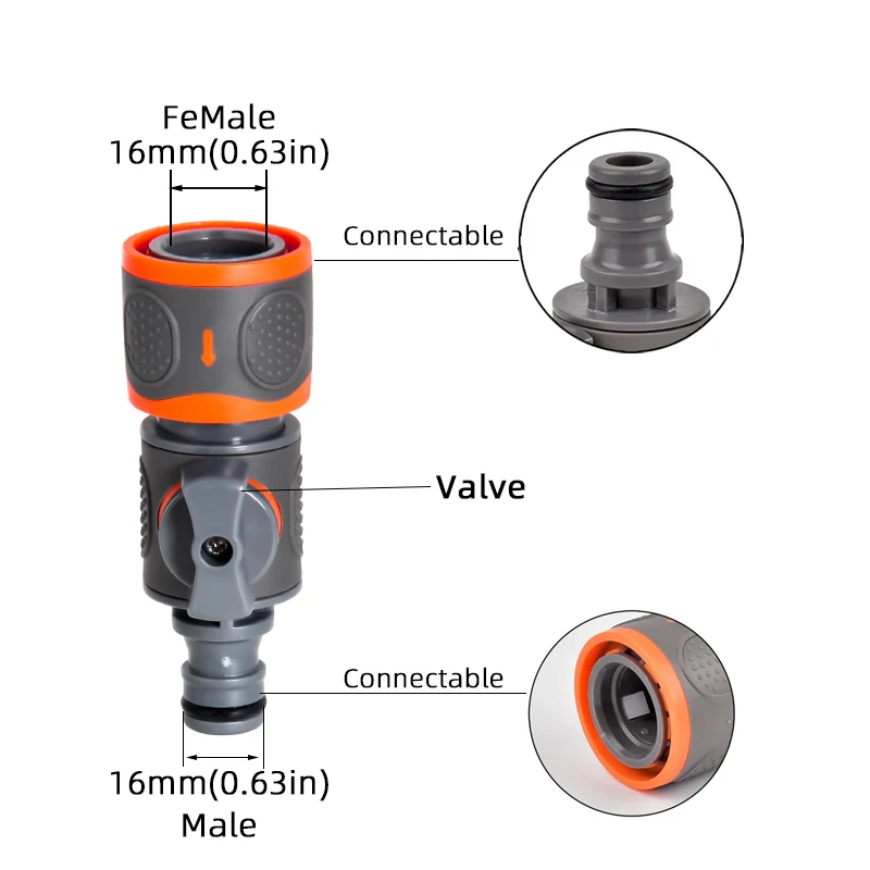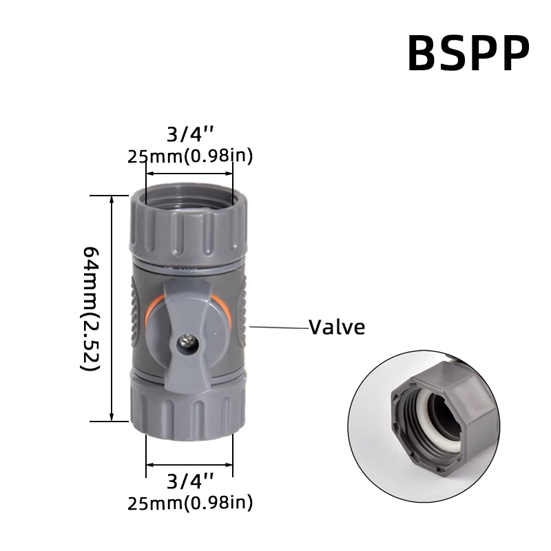 This plastic quick connect valve is meticulously manufactured in strict accordance with the BSPP (British Standard Pipe Parallel) standard. Available in sizes of 1/2 inch, 3/4 inch, and 1 inch, it belongs to the professional – grade garden water connectors category. The product is crafted from Polyoxymethylene (POM), which combines excellent mechanical strength with remarkable chemical corrosion resistance, ensuring long – term stable performance. As a quick barb connector, it comes in specifications of 16MM, 20MM, and 32MM, catering to a variety of pipe diameter requirements and offering an efficient and convenient connection solution.