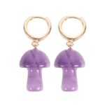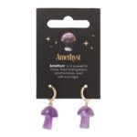 These enchanting mushroom earrings are crafted from polished amethyst. The mushroom-shaped gemstones harness the power of crystal healing, and are attached to small gold hoop earrings with a matching informational tag. Amethyst is a popular stone that promotes courage and strengthens relationships by radiating positive energy into your surroundings. Due to its nature, stone may vary in size, shape and colour.