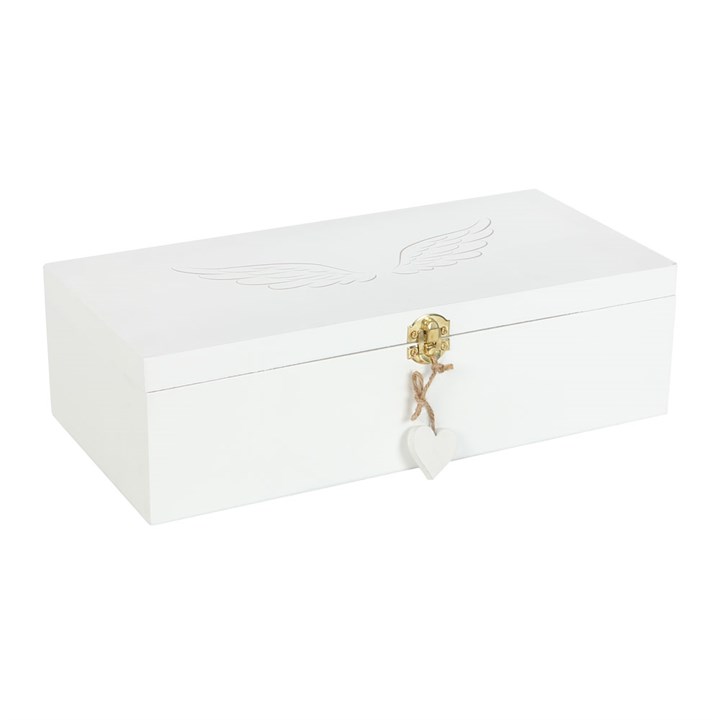 Keep cherished memories of loved ones safe for years to come with this simple and elegant memory box. Printed with a delicate angel wing design and finished with a charm on the latch, this special box makes a thoughtful gift for those in need of some extra comfort and care.