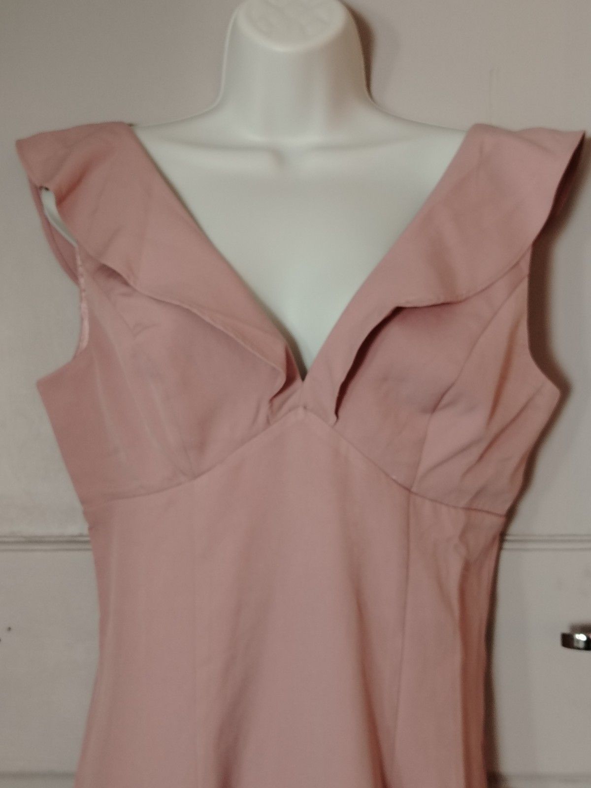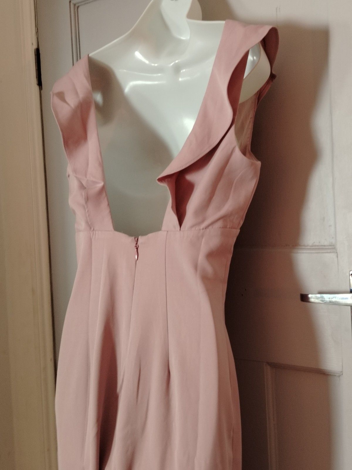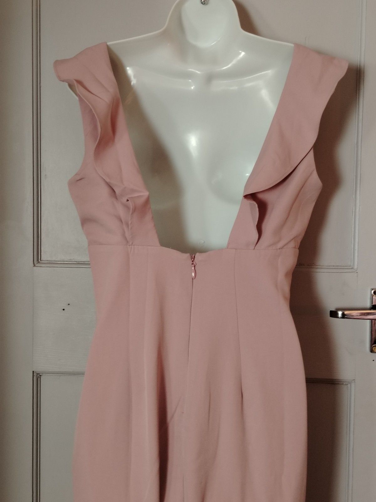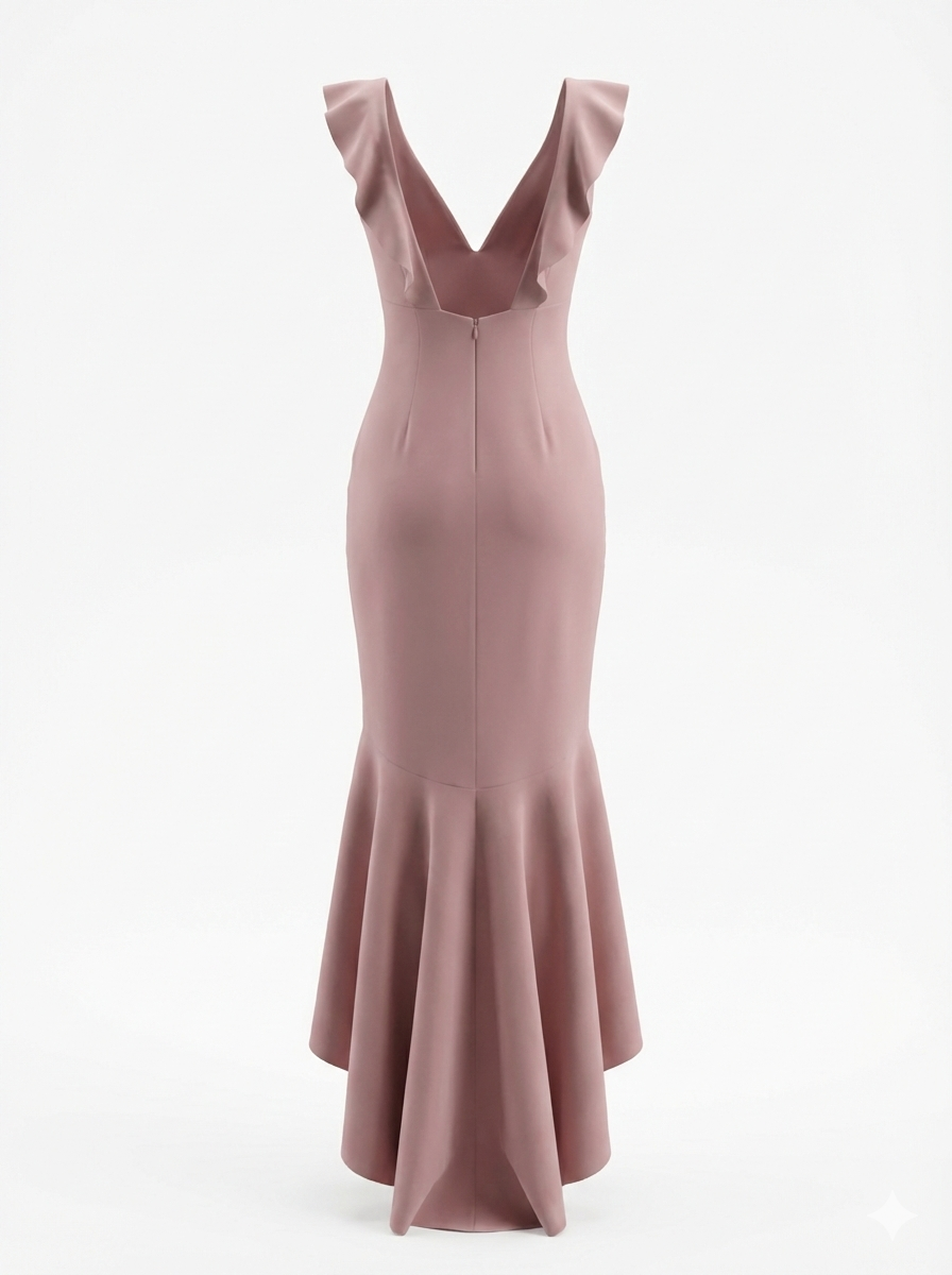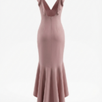Chi Chi London Zuri Dress. Designed in a beautiful ‘Mink’ shade (a dusty blush pink), this dress features a romantic ruffle neckline and a dramatic high-low fishtail silhouette that moves beautifully as you walk.