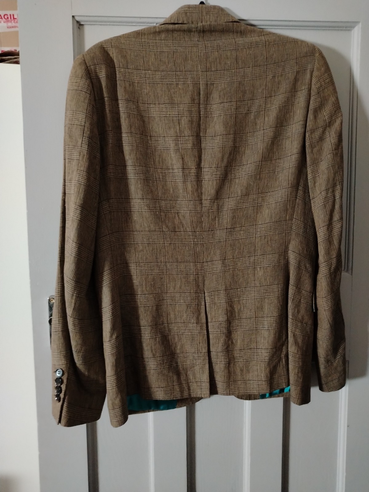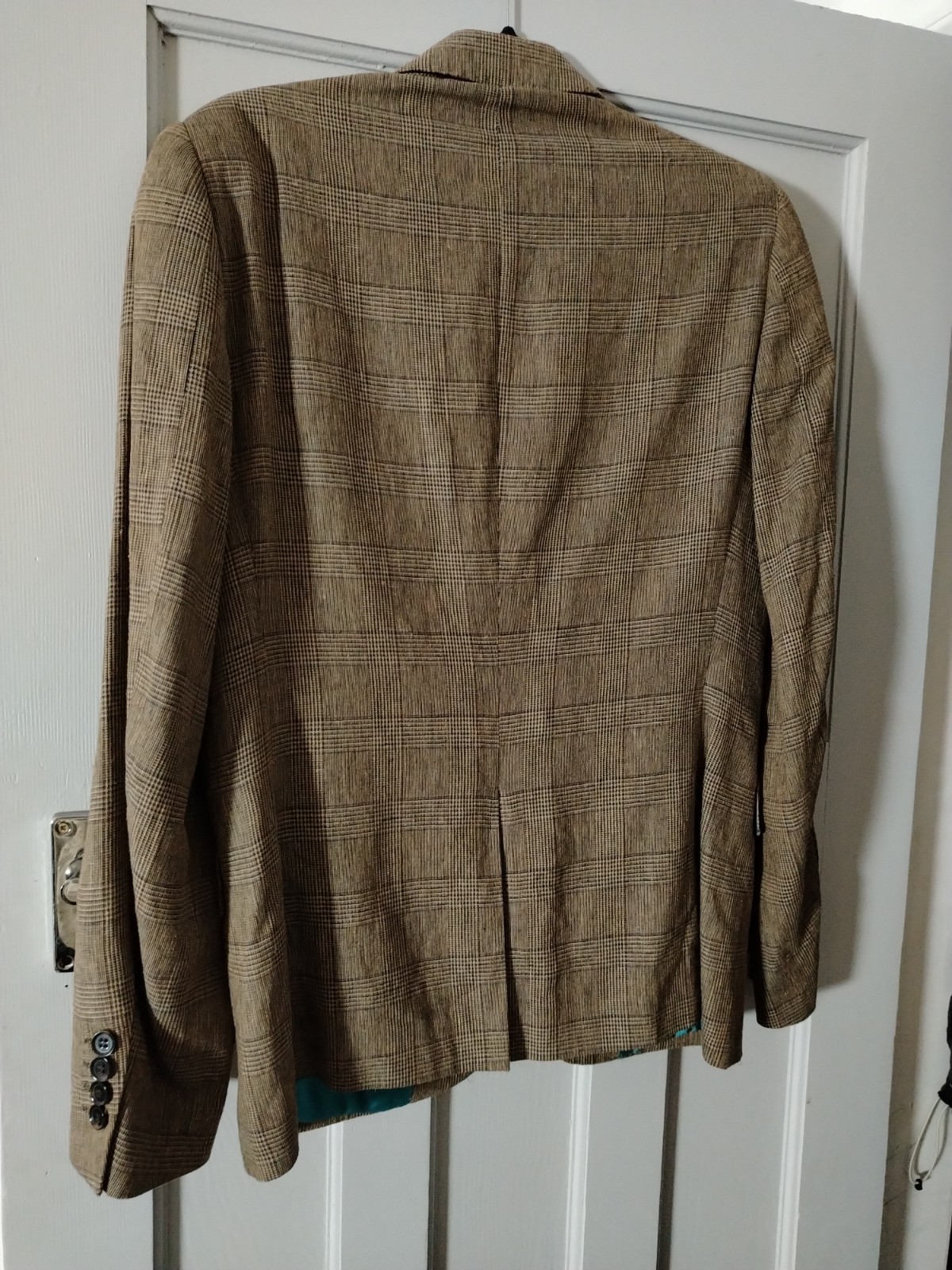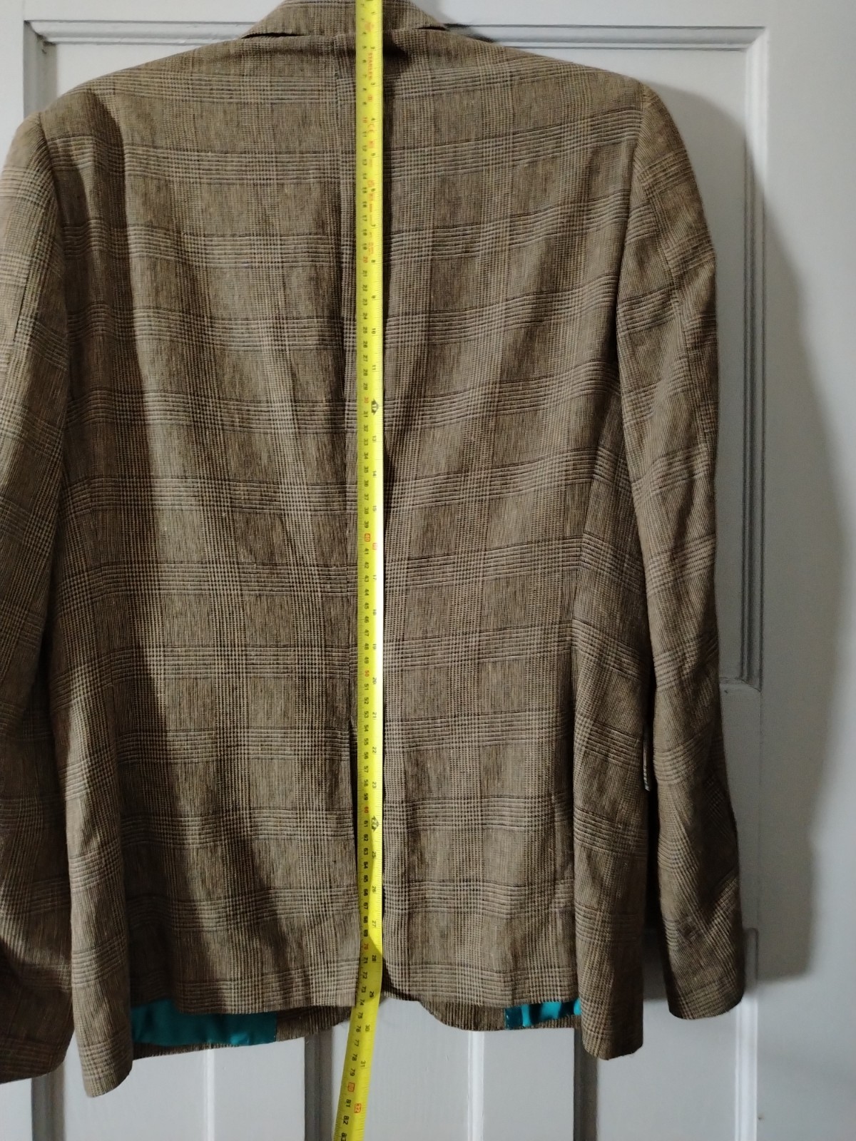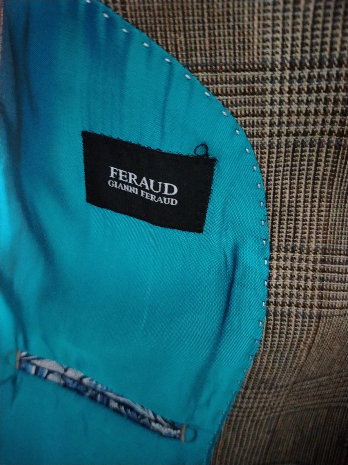 This sophisticated vintage blazer features a classic Prince of Wales style check in earthy brown and beige tones. Uniquely cut with a “Tall” fit (longer body and sleeves), it includes distinguished details such as a double-vented back, a ticket pocket, and a striking vibrant teal lining with contrasting piping.