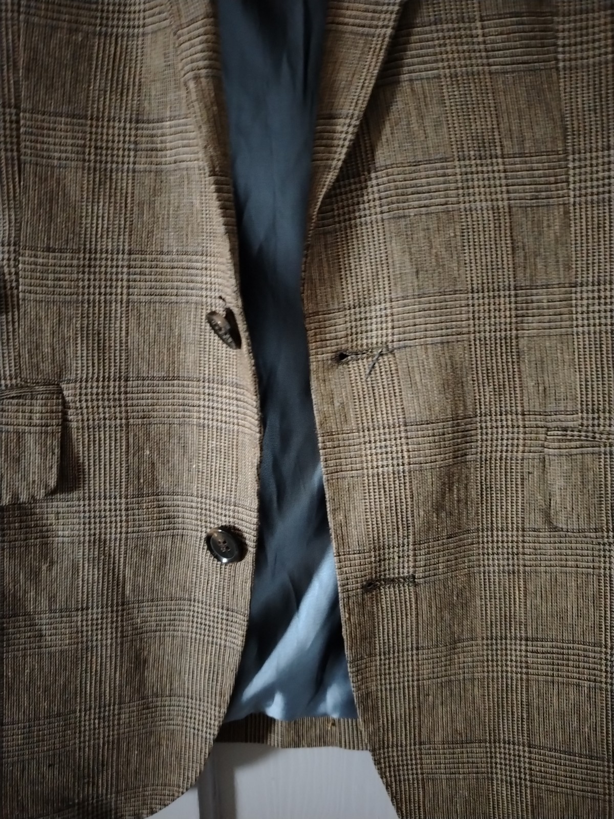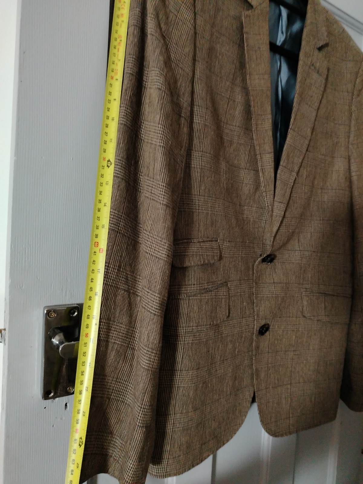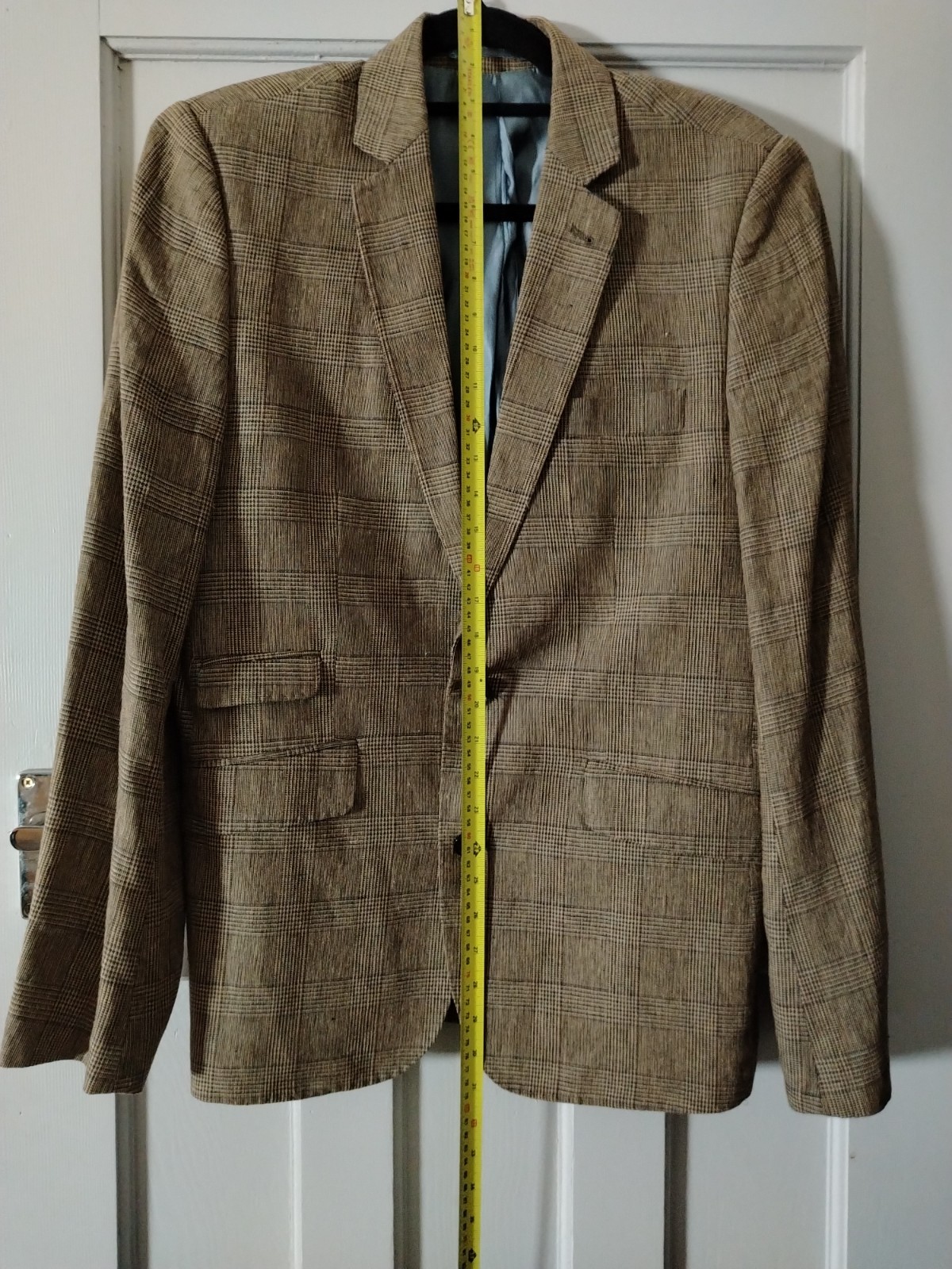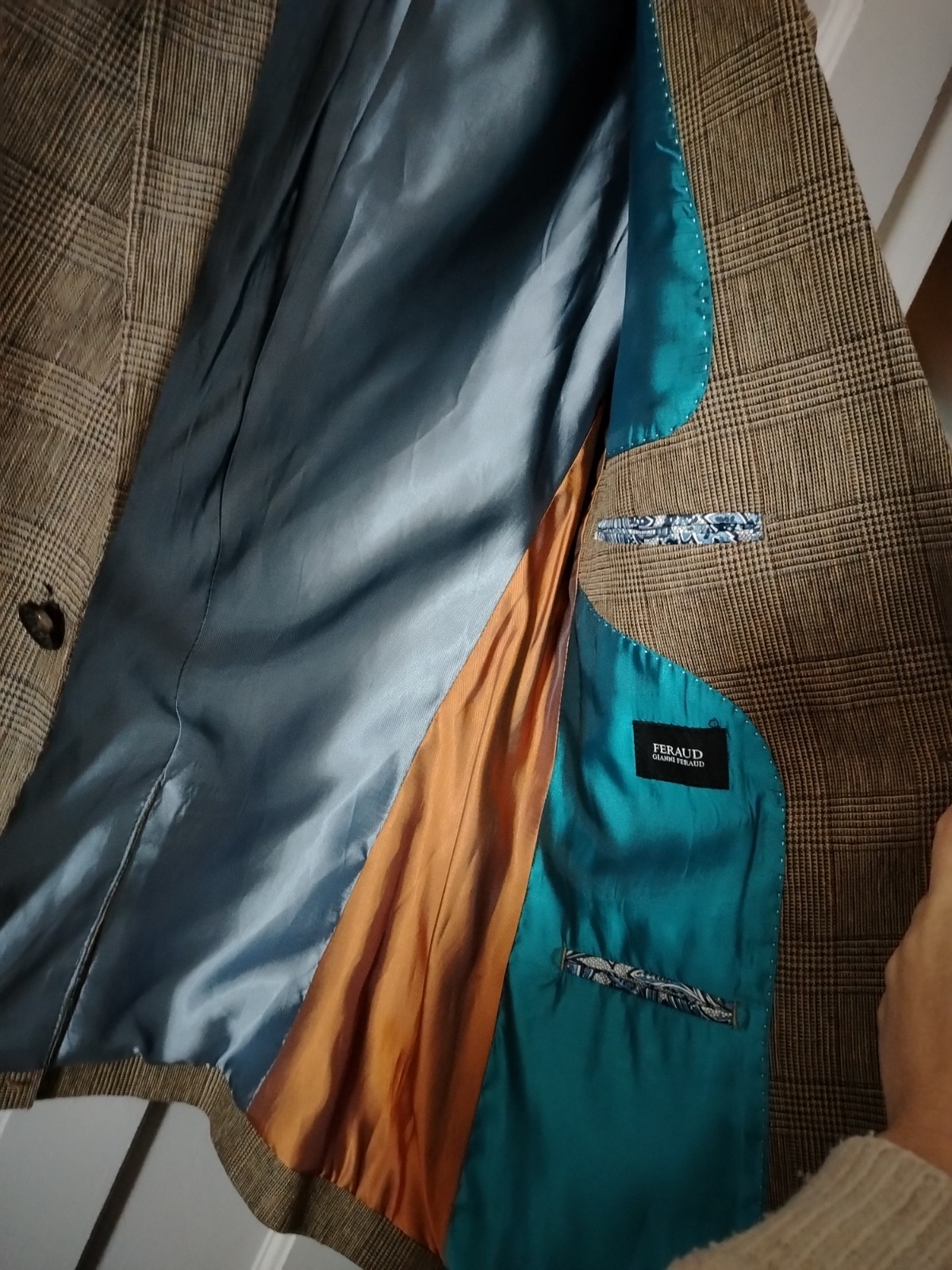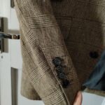 This sophisticated vintage blazer features a classic Prince of Wales style check in earthy brown and beige tones. Uniquely cut with a “Tall” fit (longer body and sleeves), it includes distinguished details such as a double-vented back, a ticket pocket, and a striking vibrant teal lining with contrasting piping.