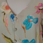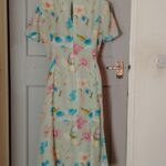 Features: V-neck front with decorative fabric-covered buttons, short sleeves, back zip closure, A-line/fit-and-flare silhouette, watercolor pastel floral print on mint ground.