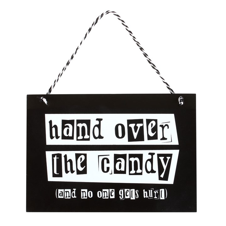 Trick or treaters will think twice before approaching any homes displaying this tongue in cheek warning sign that reads ‘Hand over the candy (and no one gets hurt)’. Designed in a contrasting black and white colourway for maximum impact.