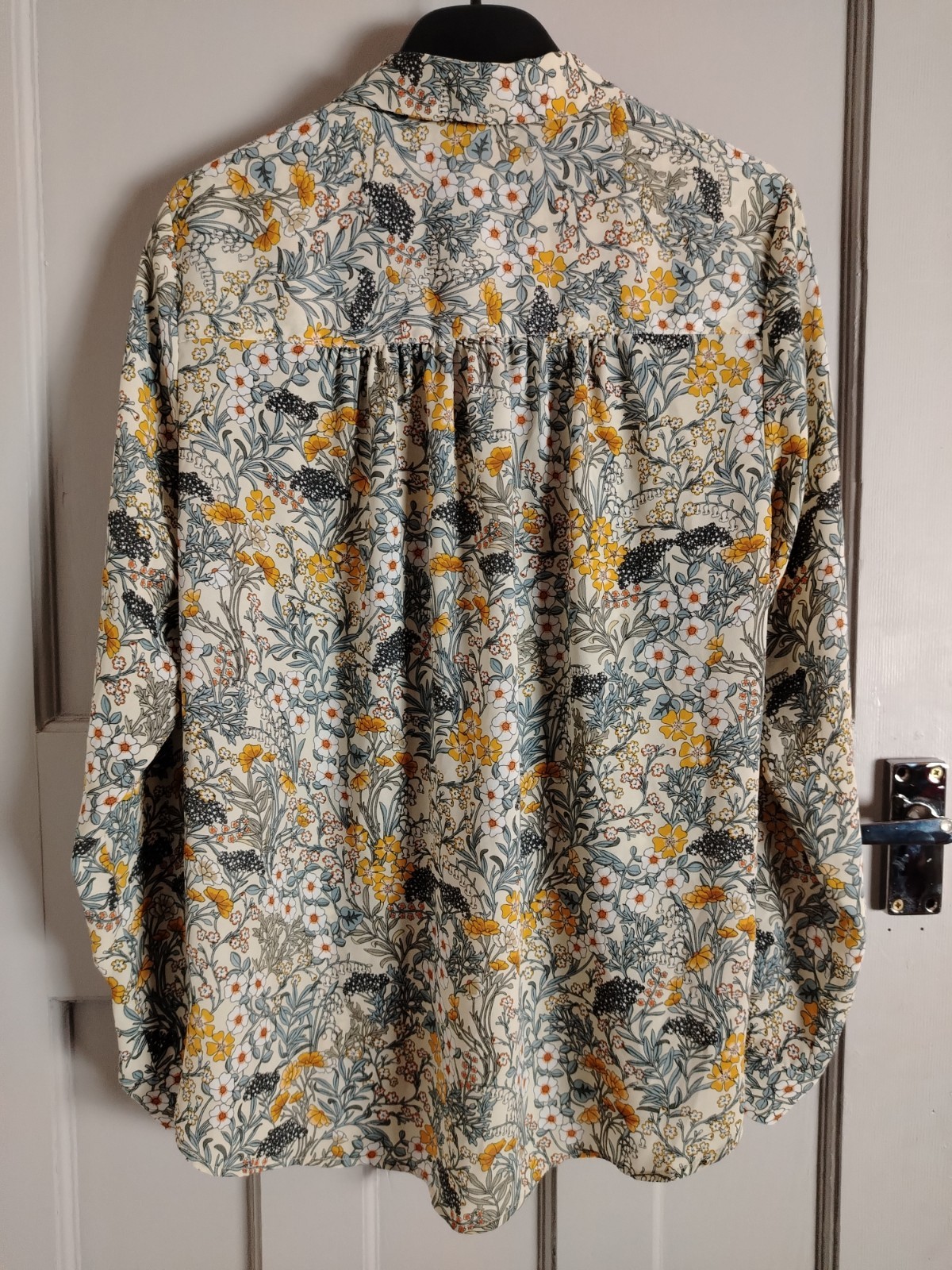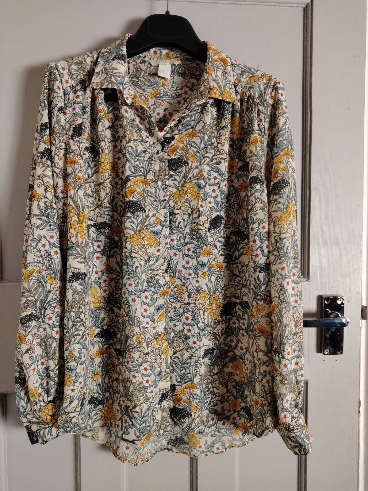H&M Floral Blouse UK14 Cream Yellow Botanical Print Long Sleeve Shirt Pre-owned