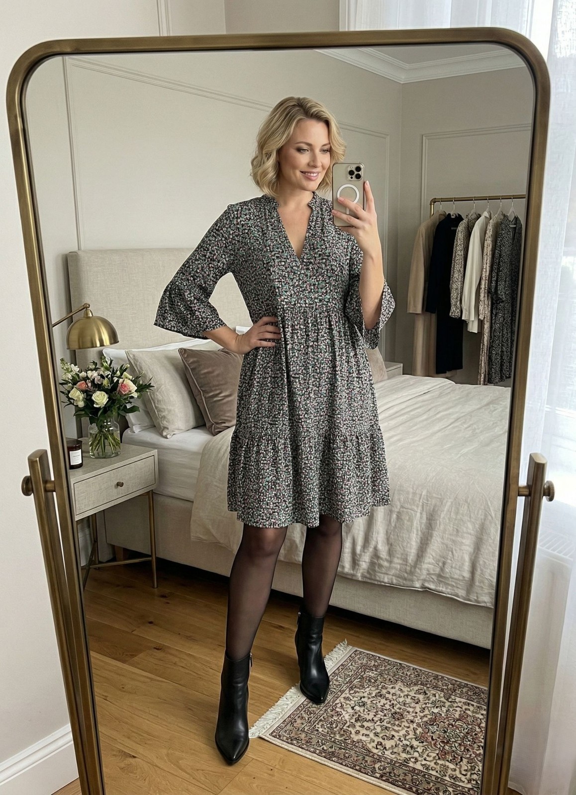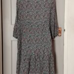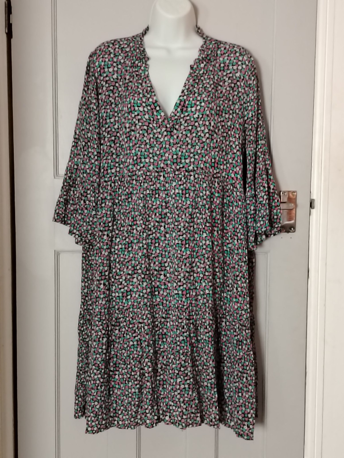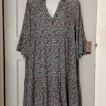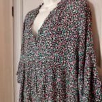Features: Tiered skirt, empire waist, V-neck, 3/4 bell sleeves, flowy relaxed fit