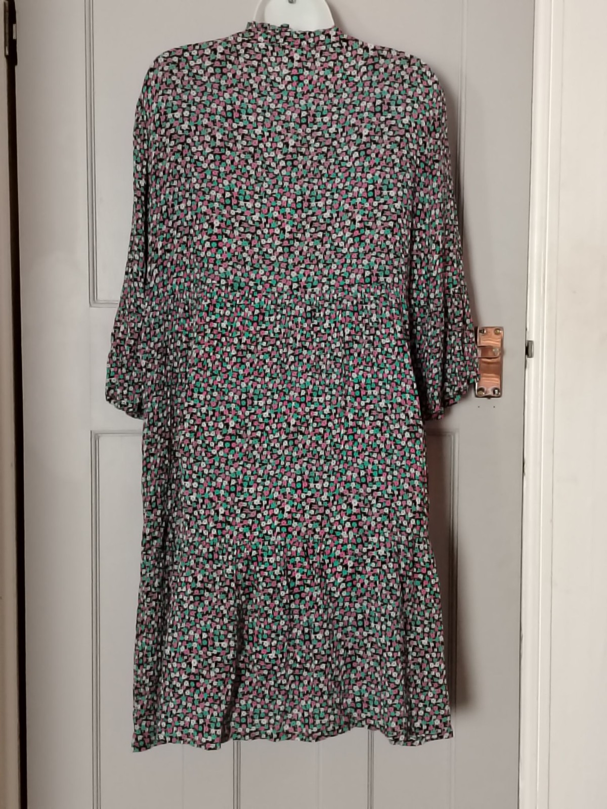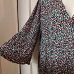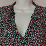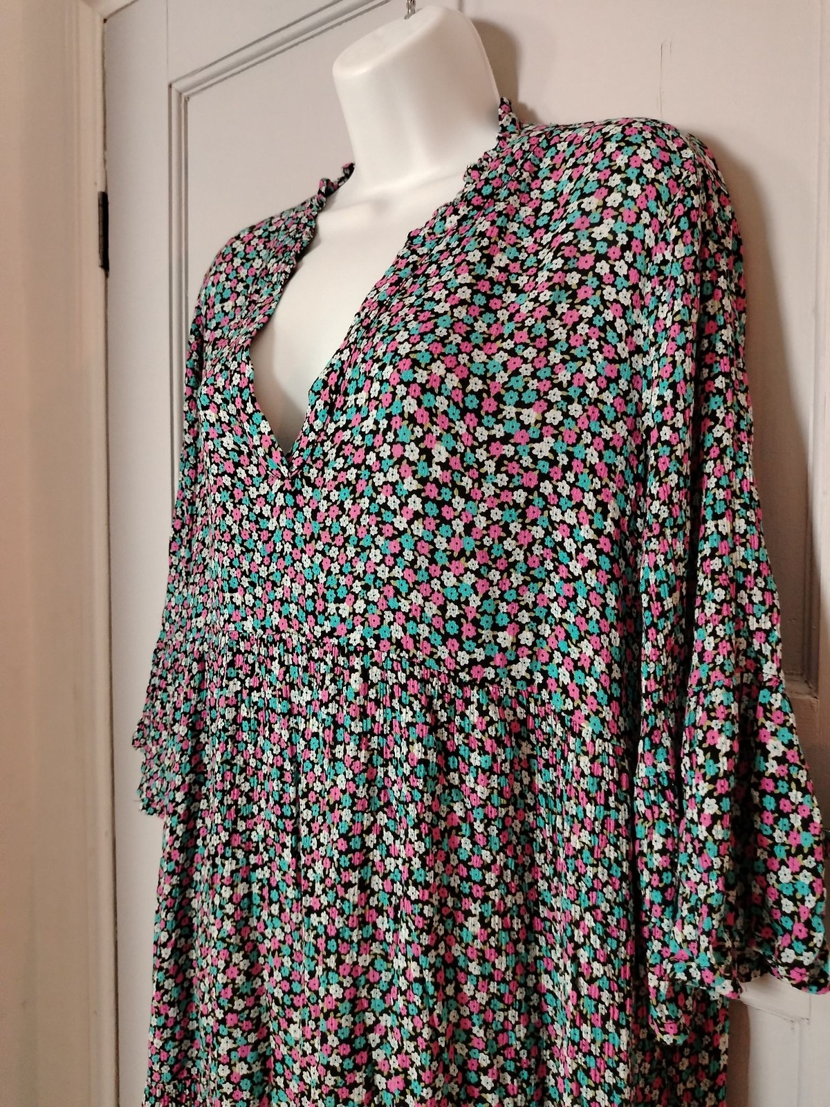 KAFFE Dress Womens 42 Floral Tiered V-Neck Bell Sleeve Empire Black Pink Teal