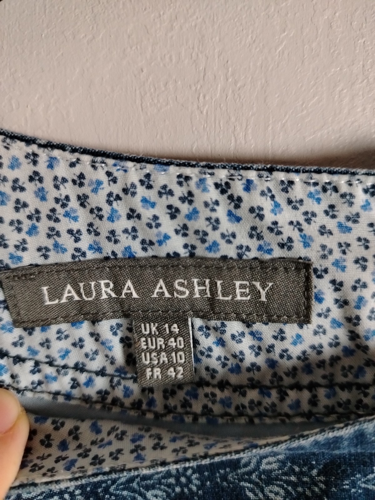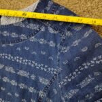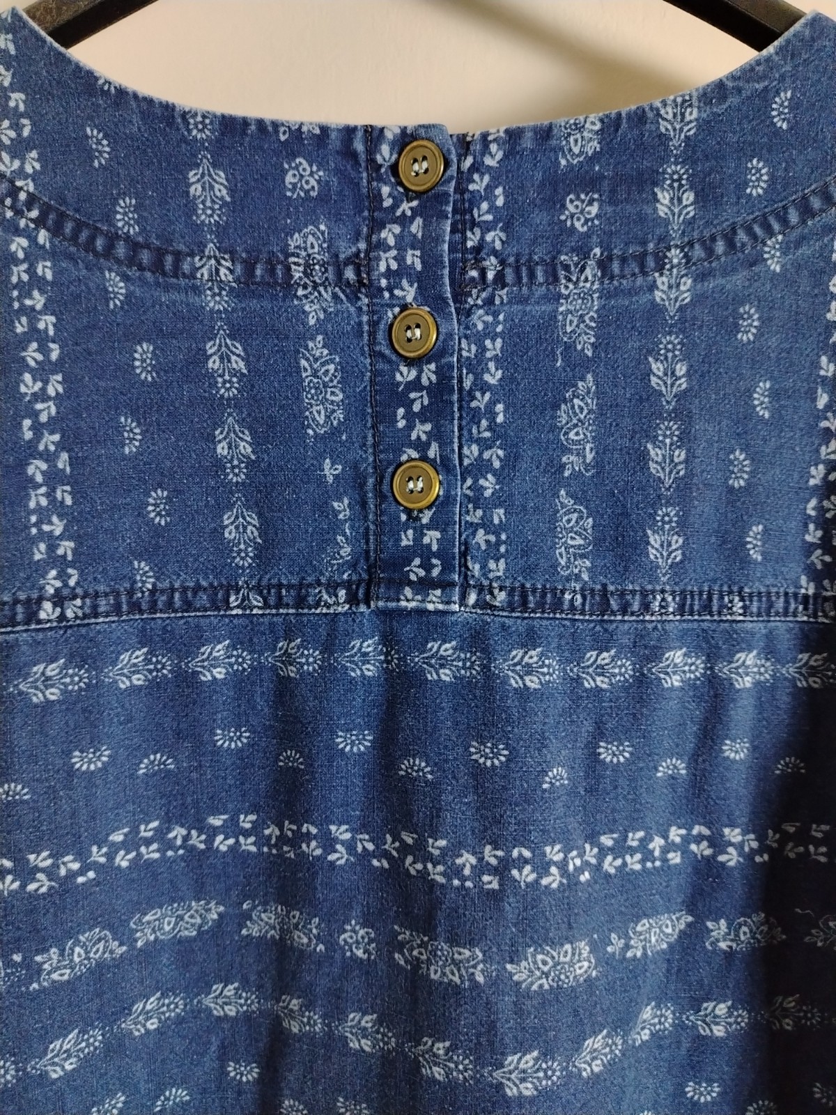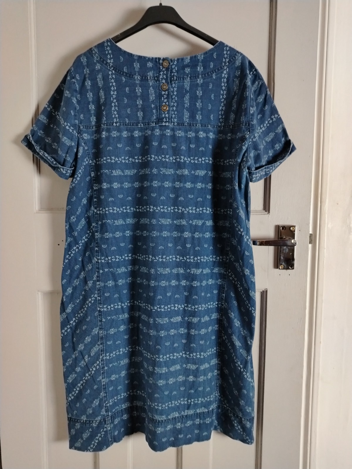 Upgrade your wardrobe with this beautiful Laura Ashley denim-style shift dress. Made from 100% breathable cotton, this pre-owned piece is in very good condition and perfect for year-round styling. It features a charming white floral/folk print, two functional front pockets, and a stylish four-button fastening at the back neck.