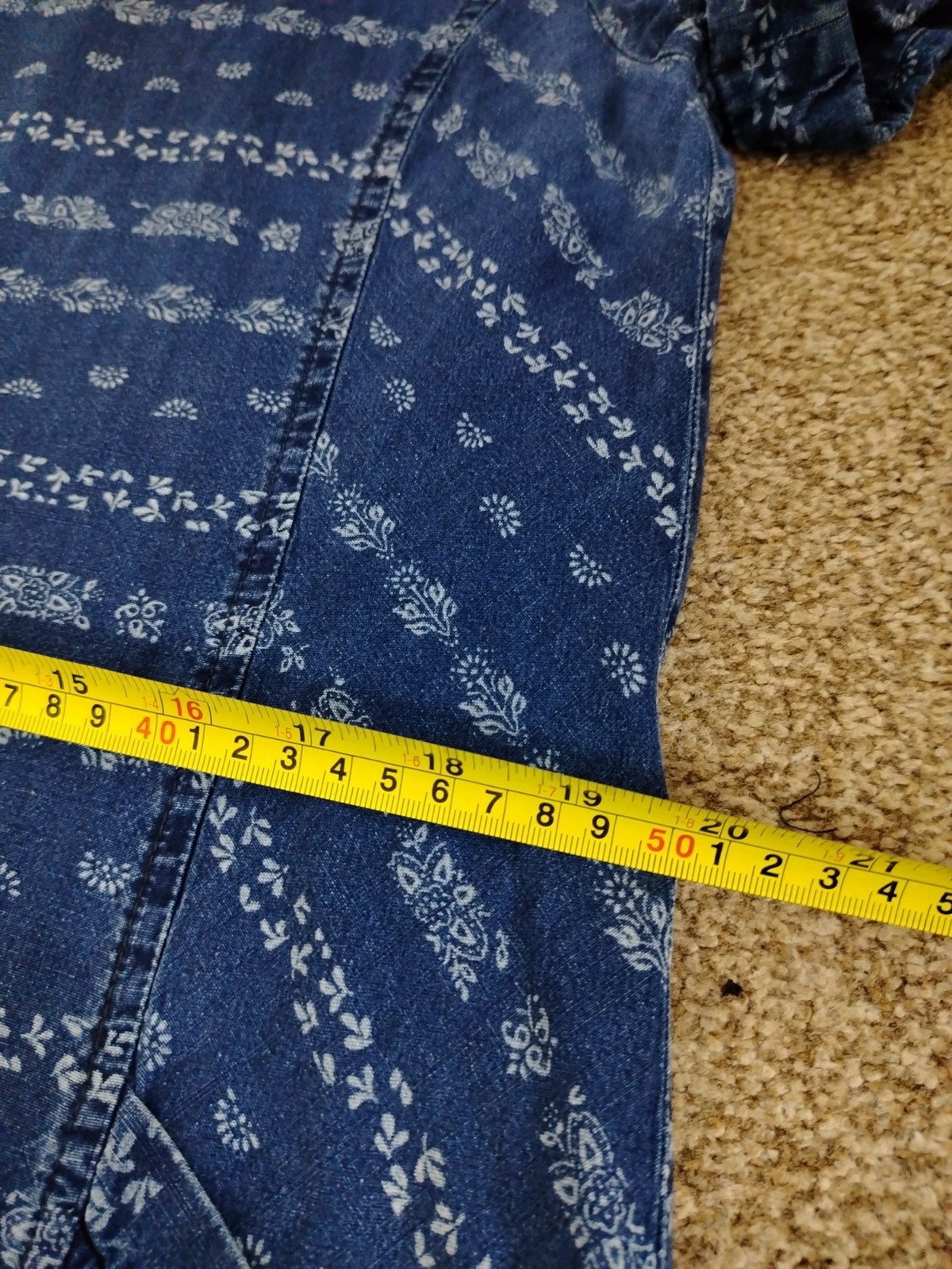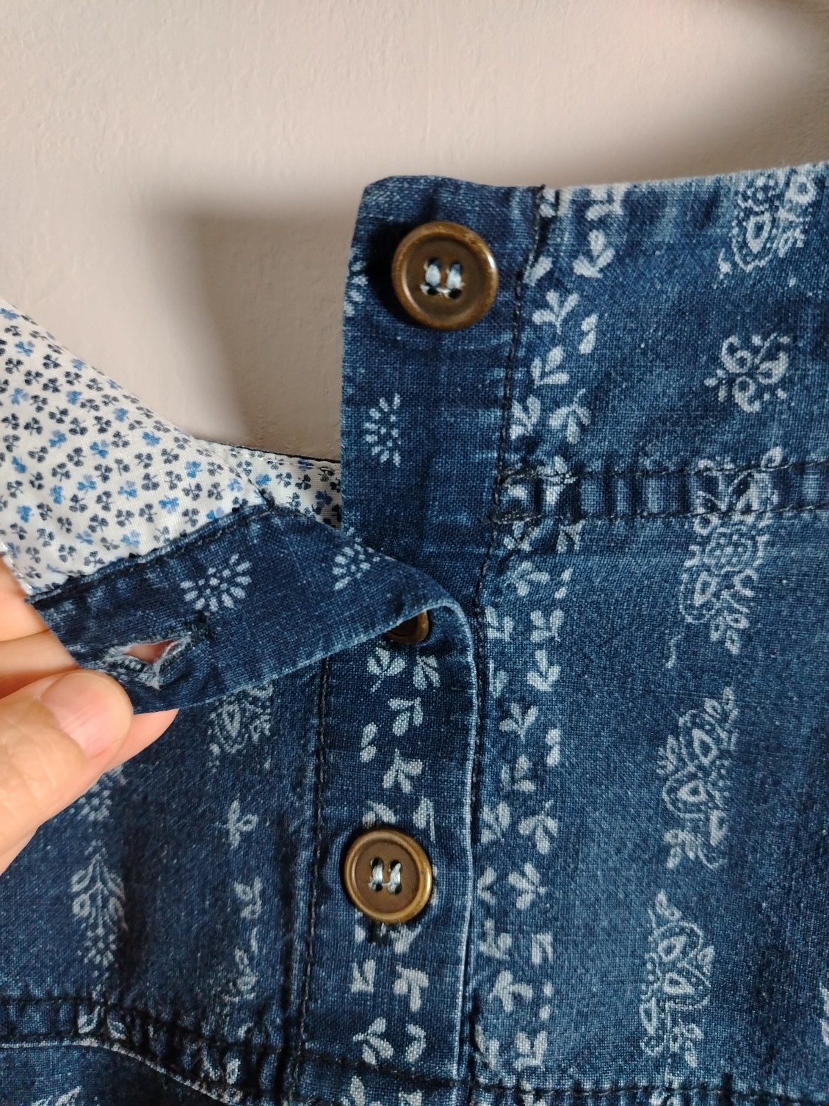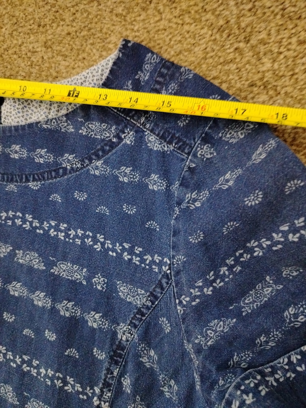 Upgrade your wardrobe with this beautiful Laura Ashley denim-style shift dress. Made from 100% breathable cotton, this pre-owned piece is in very good condition and perfect for year-round styling. It features a charming white floral/folk print, two functional front pockets, and a stylish four-button fastening at the back neck.