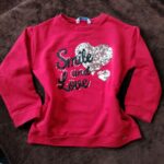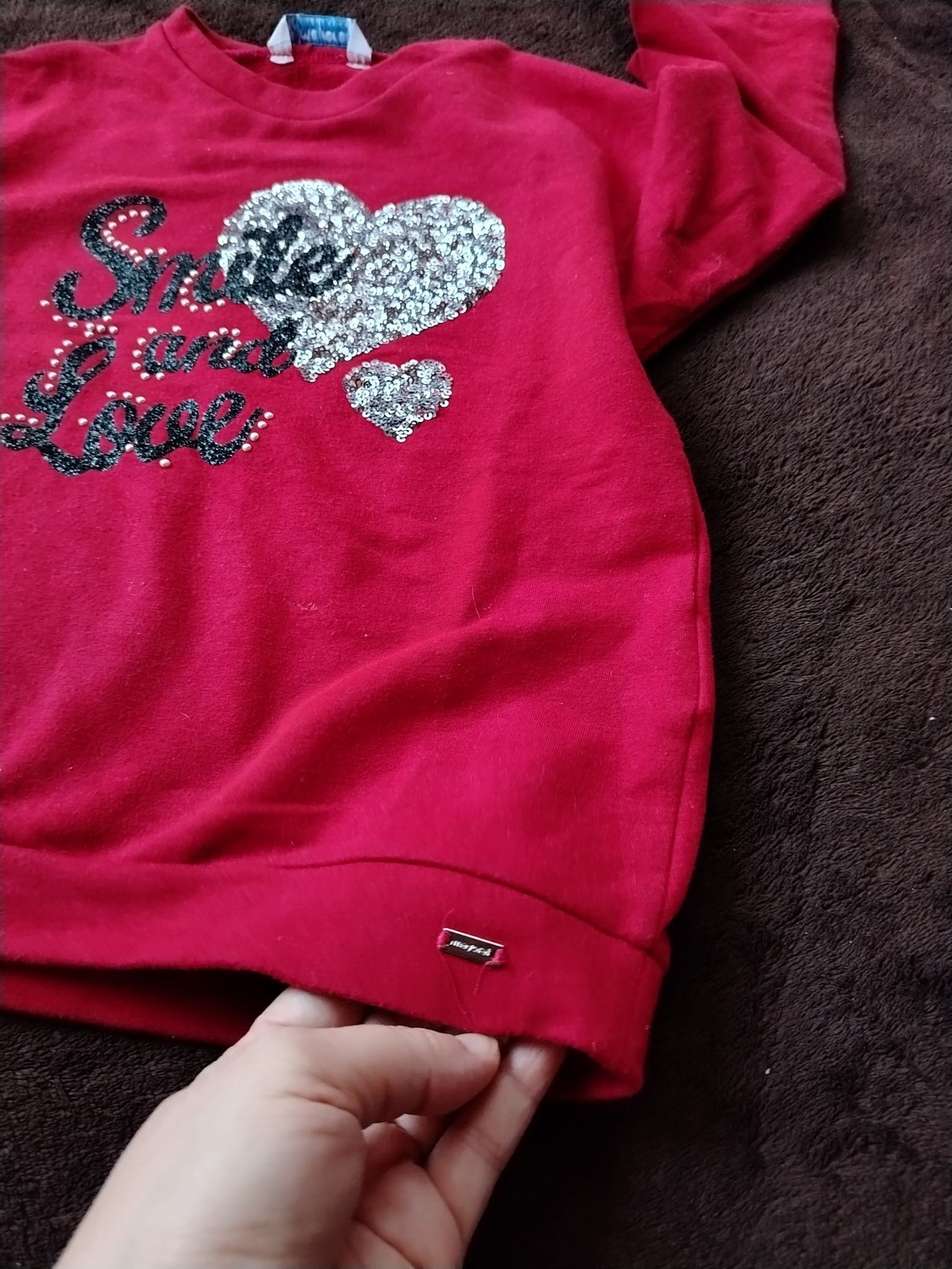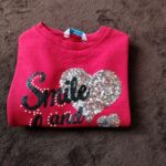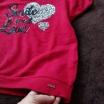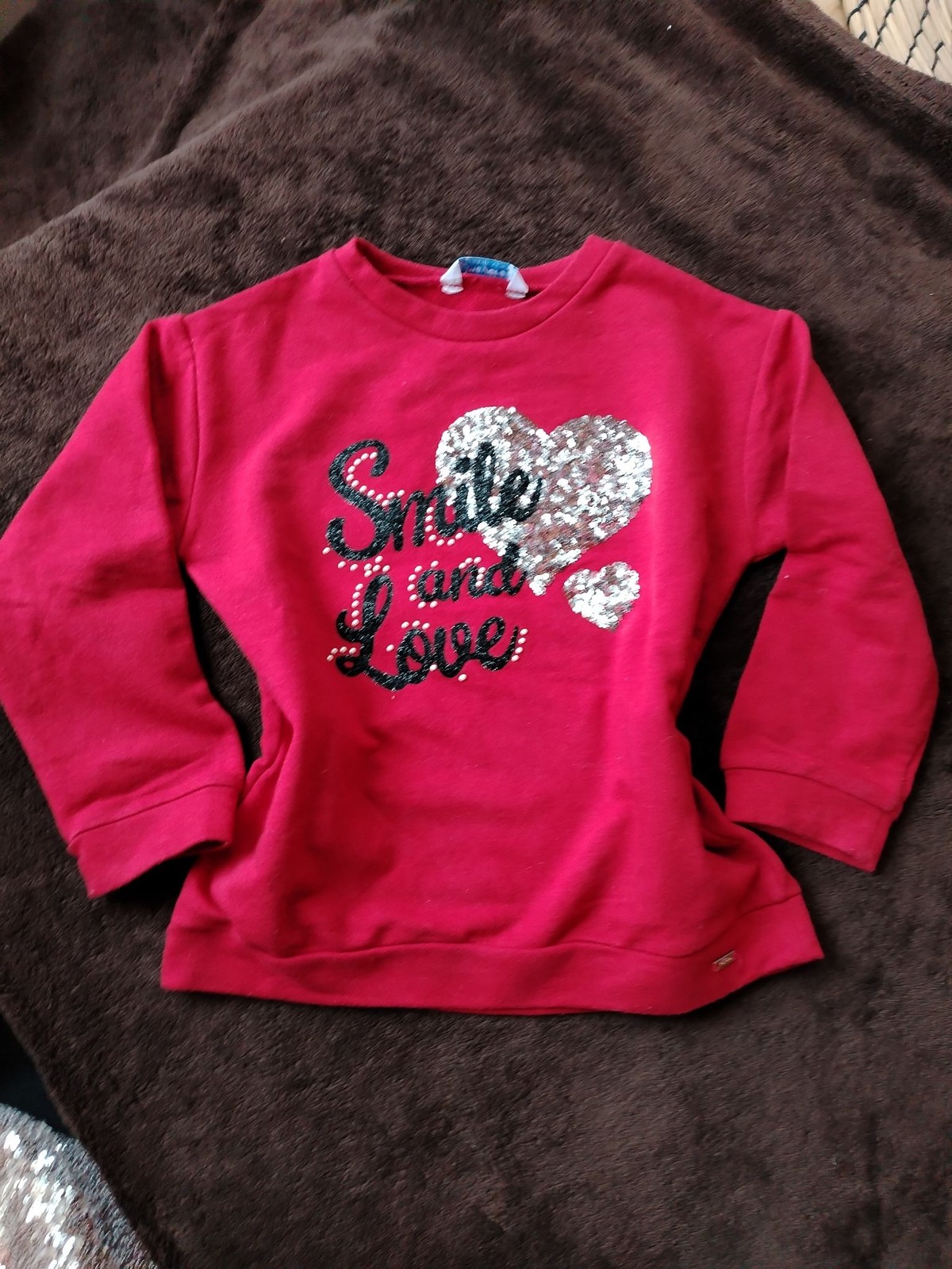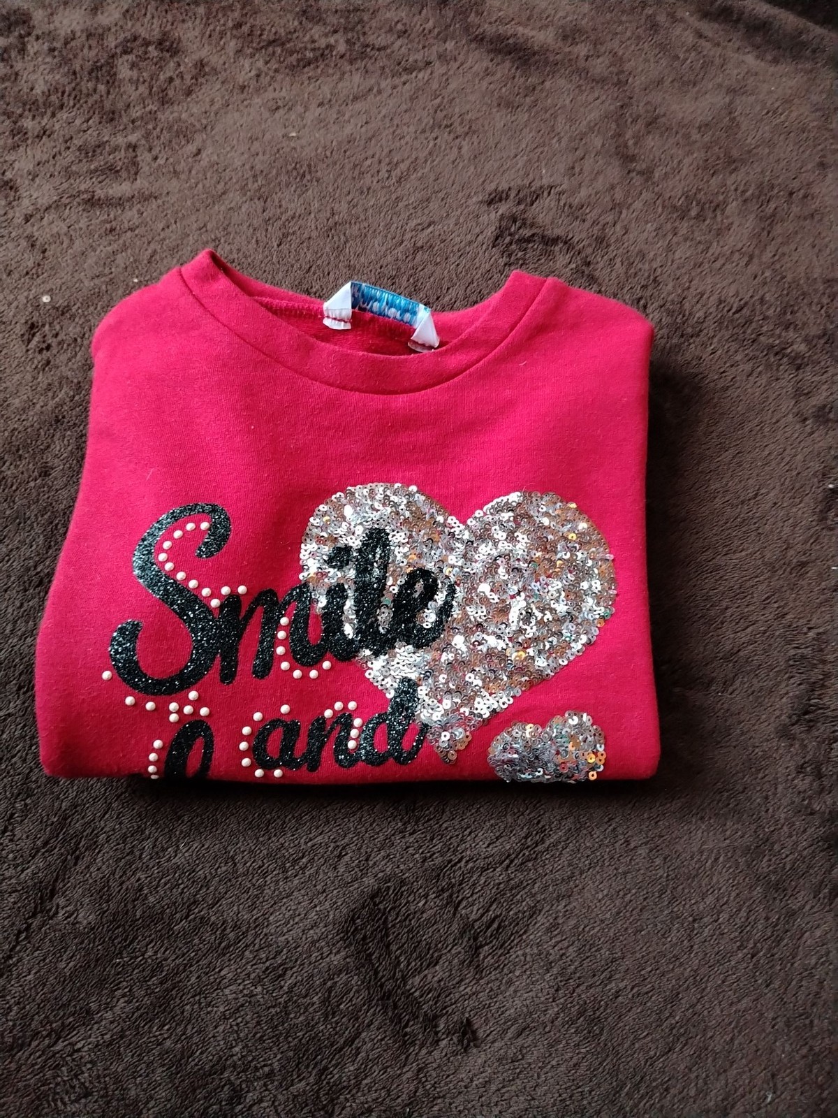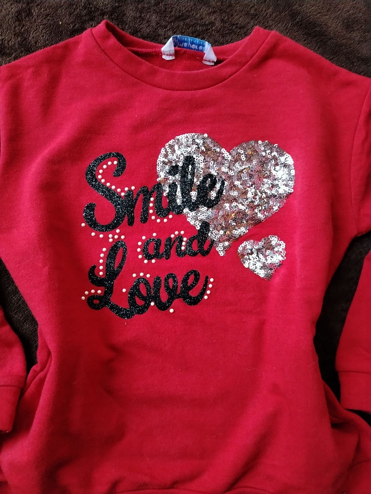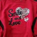 Features: Front sequin heart with smaller sequin heart and glitter script reading “Smile and Love” plus pearl stud accents