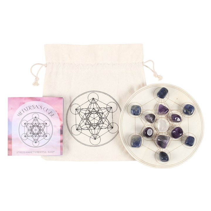 Practice the spiritual art of amplifying energies with this lovely crystal grid set. Metatron’s Cube is a geometric pattern widely recognised as a visual representation of the connection between heaven and earth. This set includes everything needed to arrange your own crystal grid for easing stress, relieving anxiety and aiding in restful sleep; 6 sodalite tumblestones, 6 amethyst tumblestones, 1 clear quartz tumblestone, an engraved wooden grid and an instructional insert card all presented in a printed drawstring bag. Product Dimensions: H1.5cm x W18cm x D18cm Packaged Dimensions: H2.5cm x W20cm x D25cm