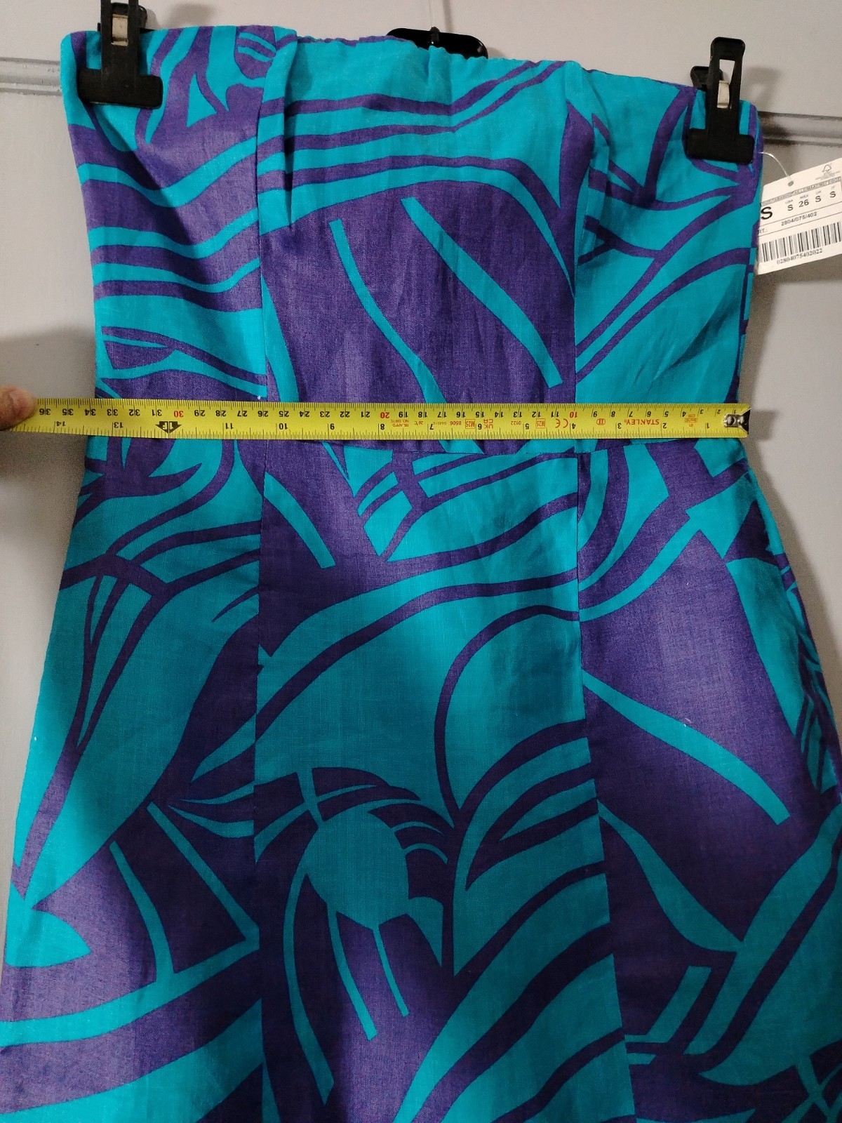 Stunning strapless mini dress by Zara Basic. This piece is absolutely brand new with tags (NWT) and ready to wear.It features a vibrant, bold abstract tropical-style print in striking shades of teal/turquoise and purple. The dress is fitted through the bodice and waist, fastening with a concealed zip at the back. There is also a small vent/slit at the back hem for ease of movement.