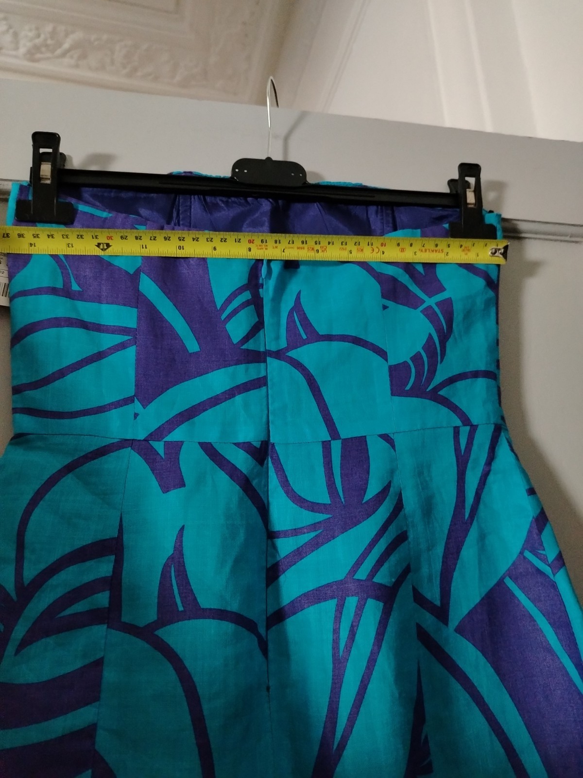 Size: Labelled EUR S, which translates to a UK size 8. Please check the measurements below to ensure a good fit.Approximate Measurements (taken taken with the dress laying flat):Across top edge (bust area): 38 cmWaist (across narrowest part): 34 cmHips (across widest part): 44 cmFull Length (from top edge down to hem): 70 cm