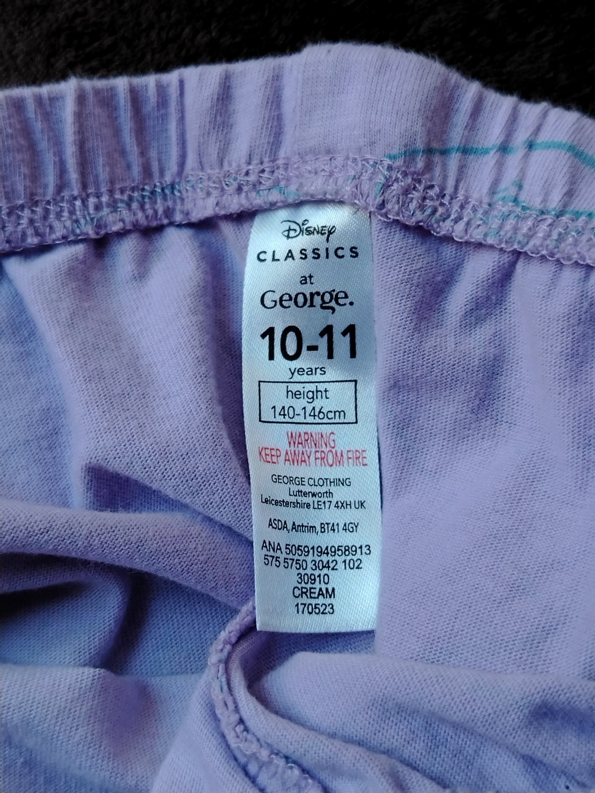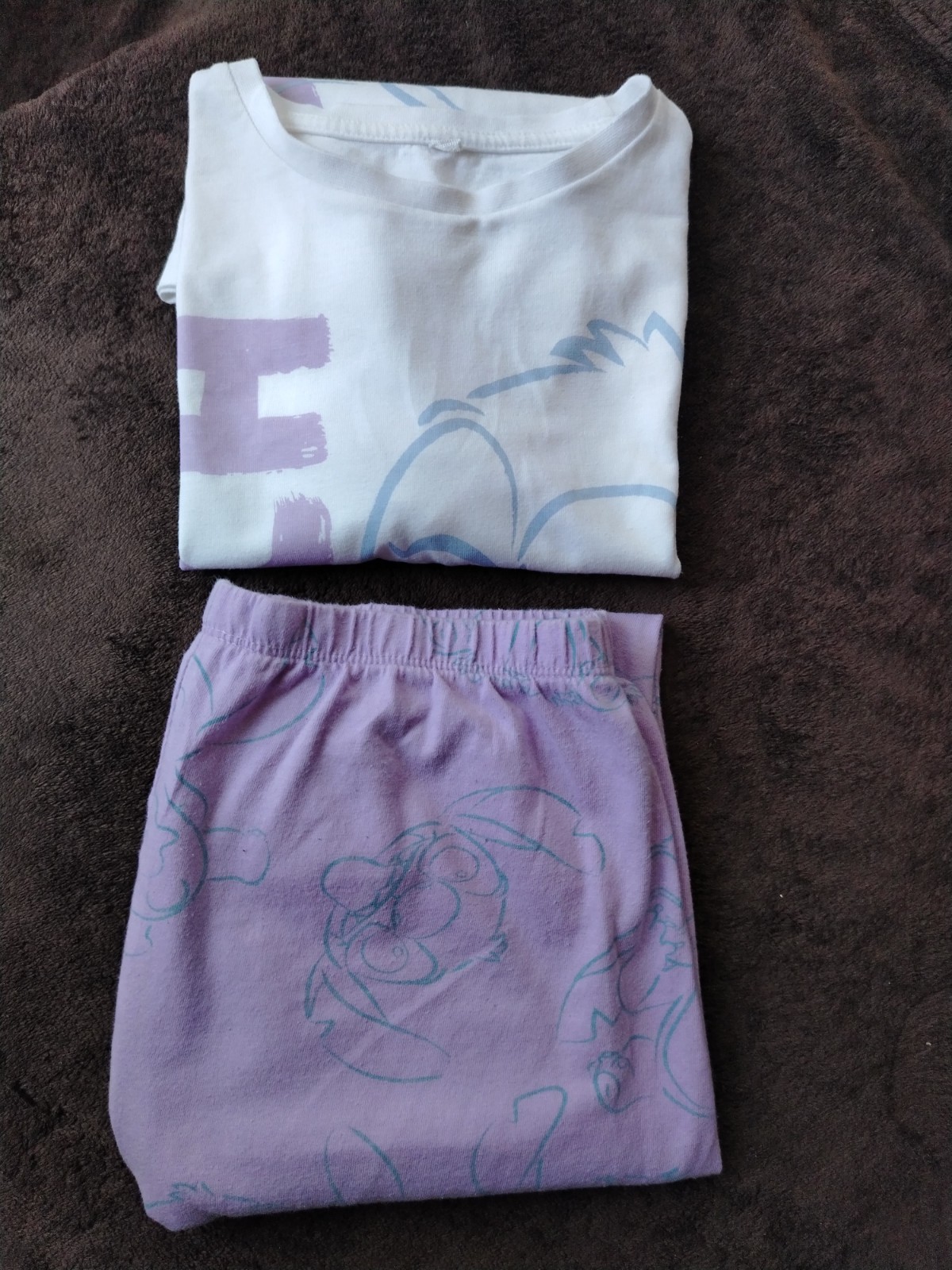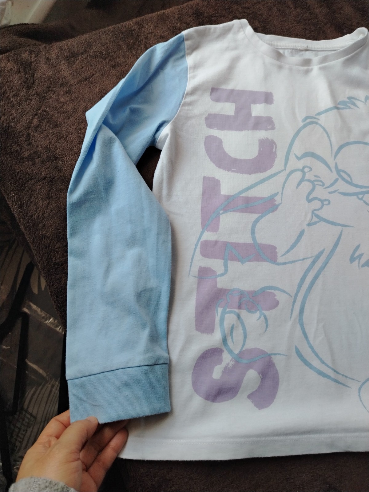 Lovely 2-piece Disney Stitch pyjama set. This set features a long-sleeved white top with light blue contrast sleeves and a large Stitch graphic. The matching purple trousers have an all-over Stitch print and cuffed ankles for a comfortable fit.