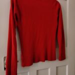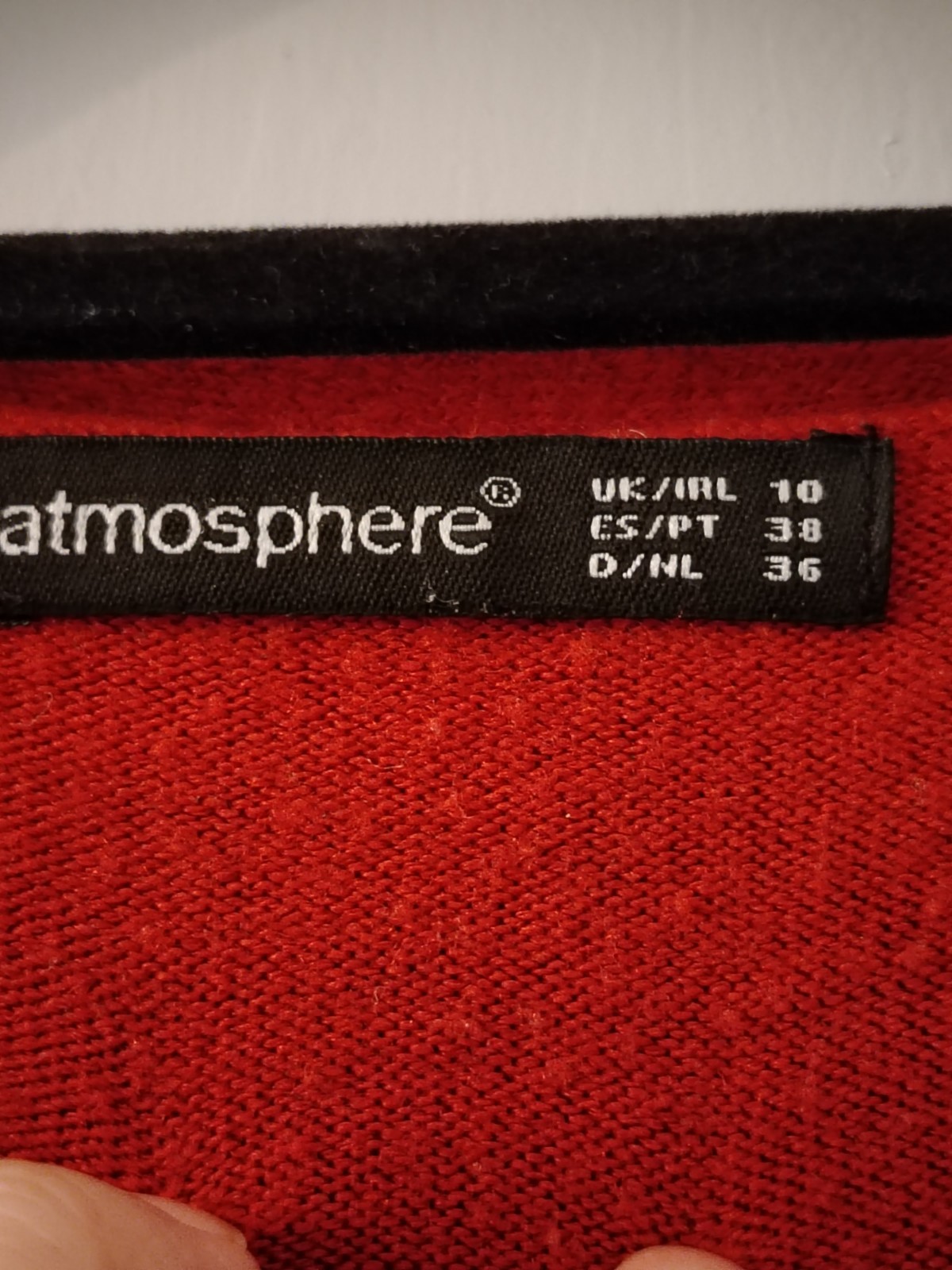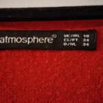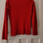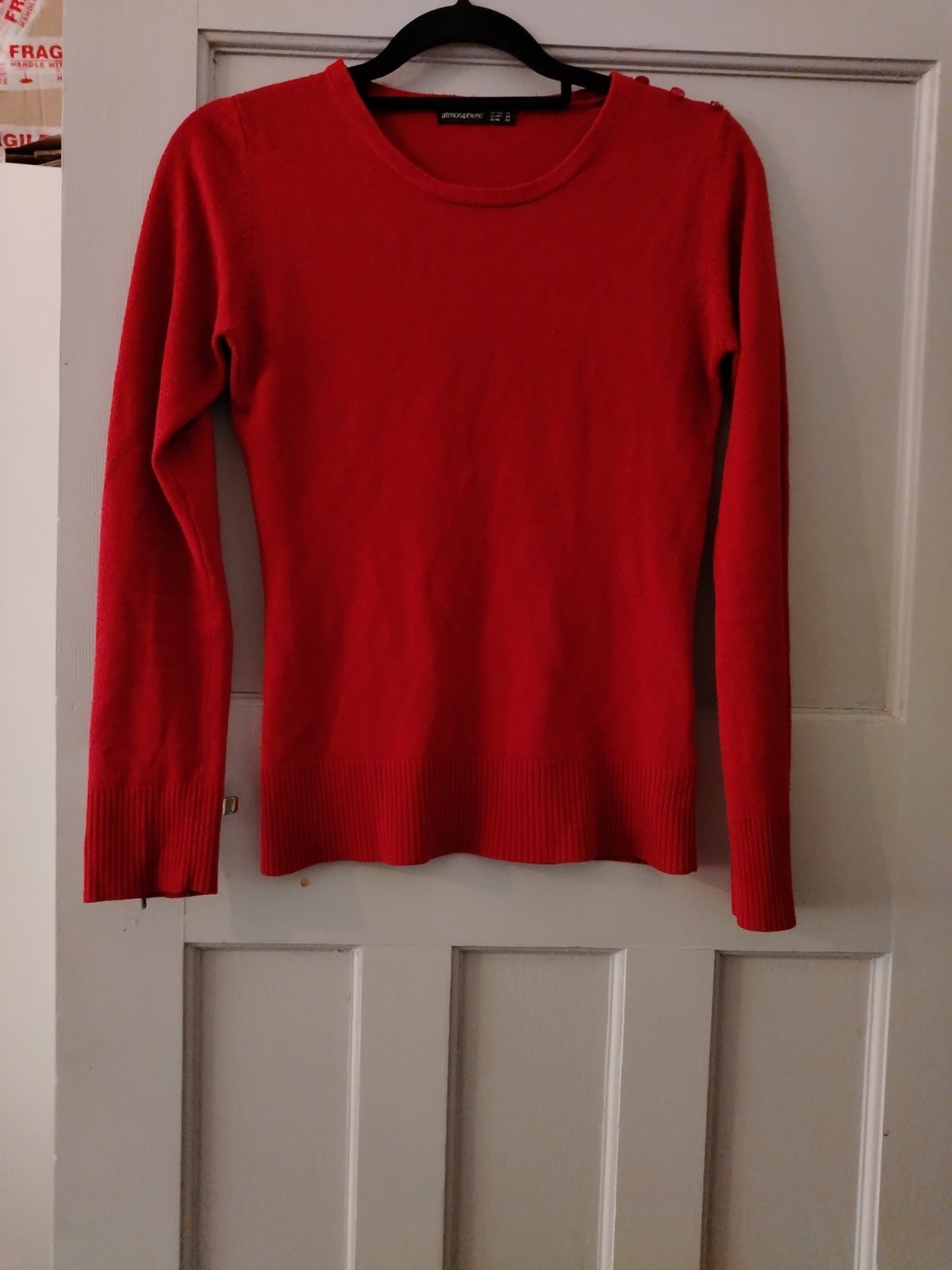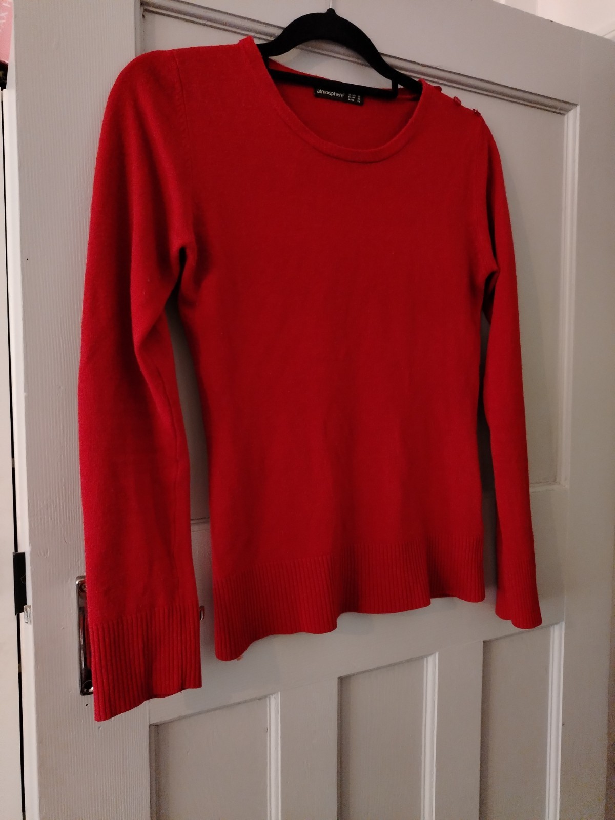 This is a classic red fine knit jumper by Atmosphere. It features a crew neckline and a distinctive design detail with three matching red buttons along the left shoulder. The jumper has long sleeves and is finished with ribbed cuffs and a ribbed hem for a comfortable fit. This item is in excellent pre-loved condition and is a versatile piece suitable for casual wear or layering in cooler weather.