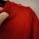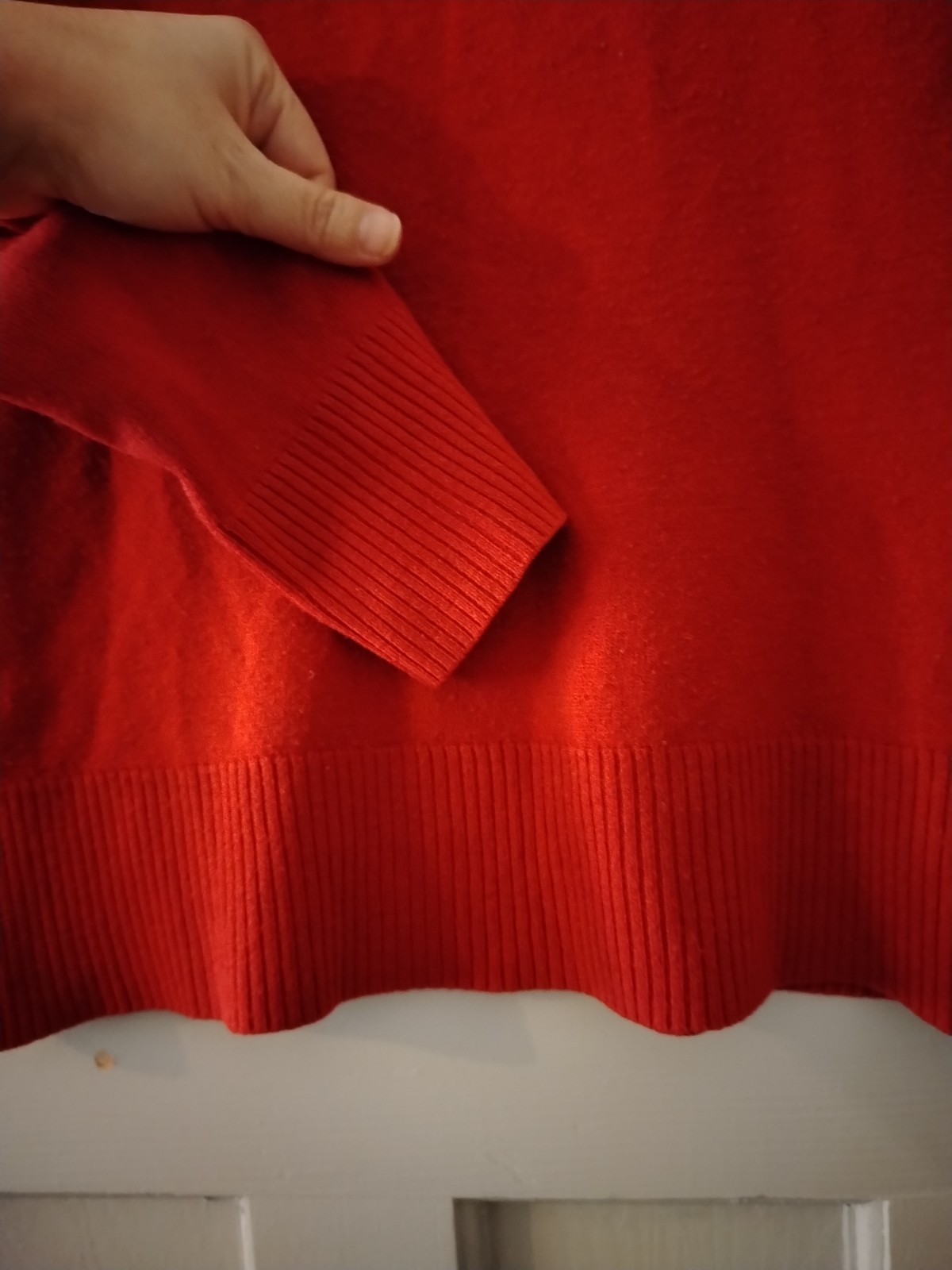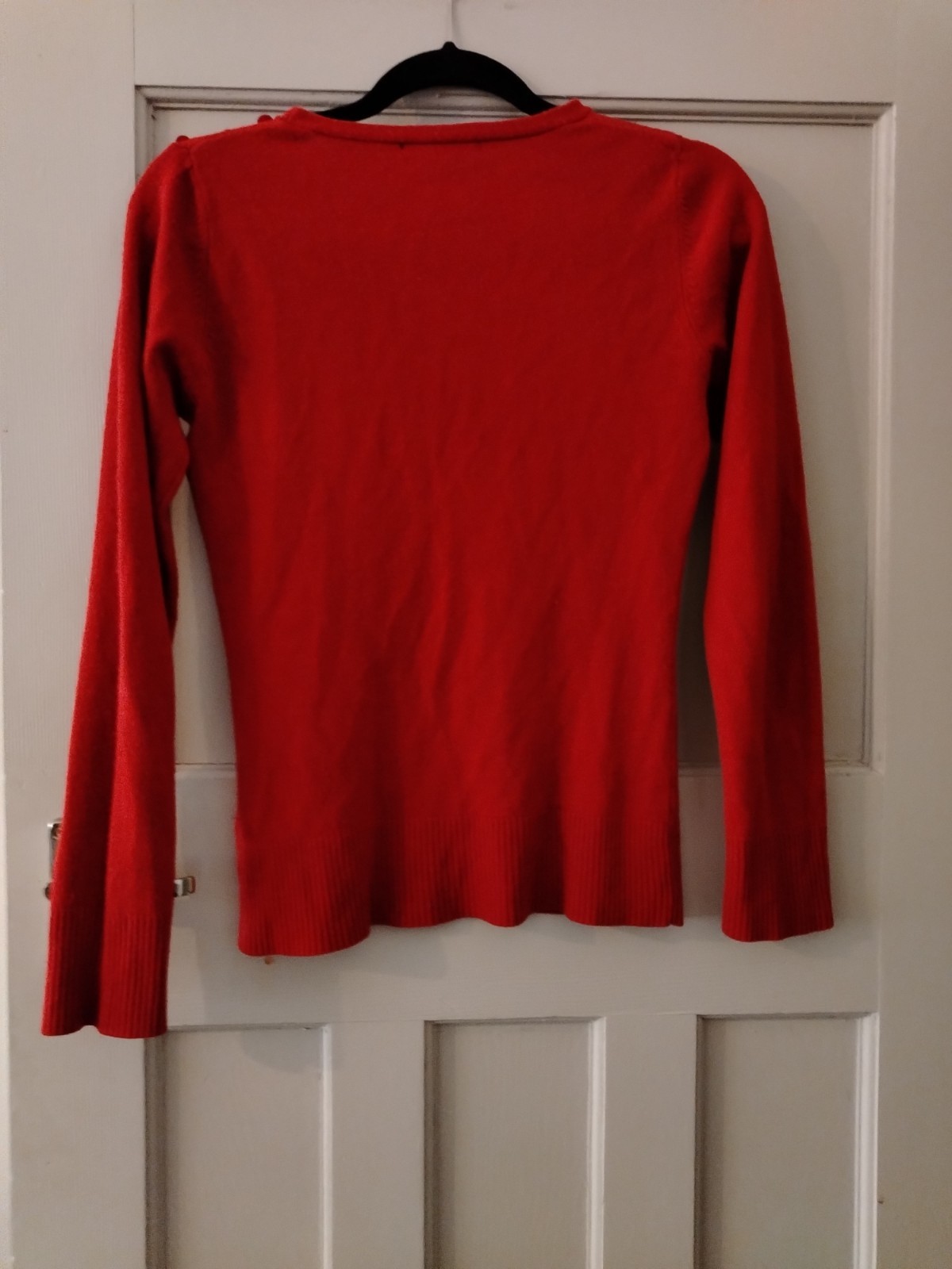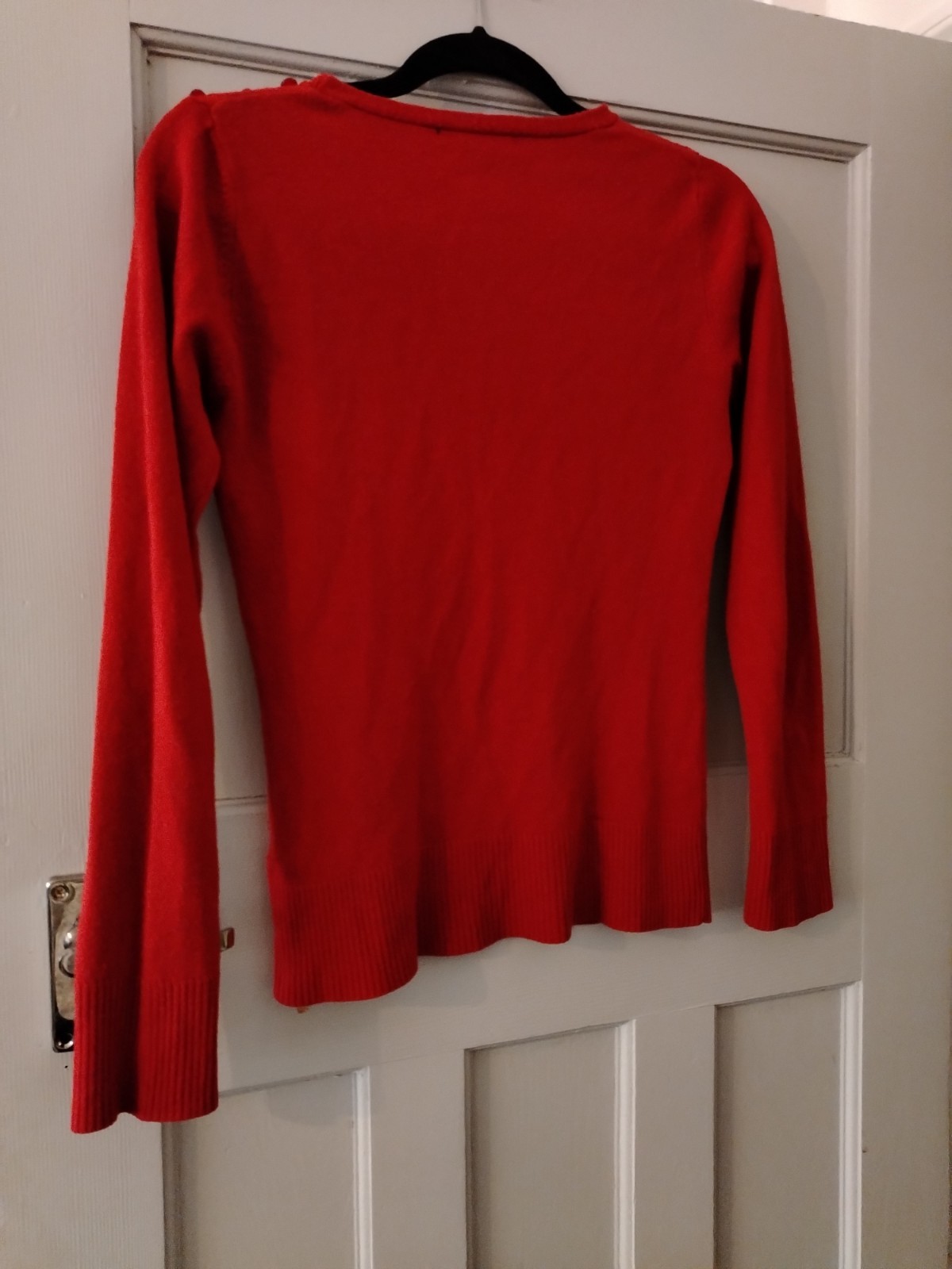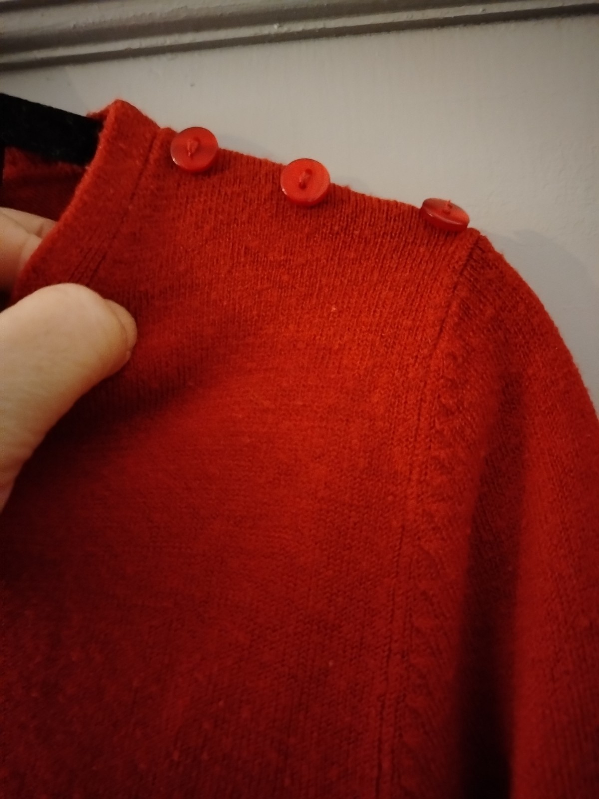This is a classic red fine knit jumper by Atmosphere. It features a crew neckline and a distinctive design detail with three matching red buttons along the left shoulder. The jumper has long sleeves and is finished with ribbed cuffs and a ribbed hem for a comfortable fit. This item is in excellent pre-loved condition and is a versatile piece suitable for casual wear or layering in cooler weather.