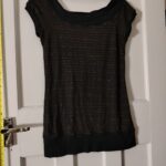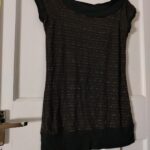 Black & Bronze Glitter Elevate your evening wardrobe with this lovely tunic style top from Miss Selfridge. Featuring a sophisticated black fabric base illuminated by thin, horizontal metallic copper and bronze glitter stripes, this piece offers effortless glamour. Designed with a flattering wide boat neckline and cap sleeves, finished with a solid black wide band at the hem for a structured silhouette.