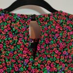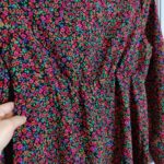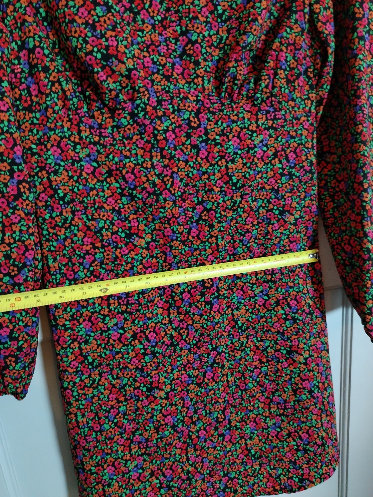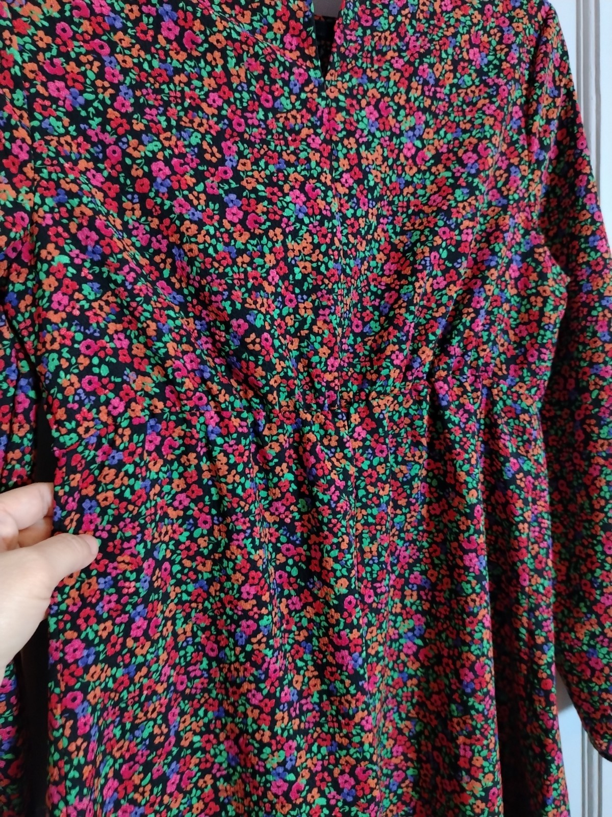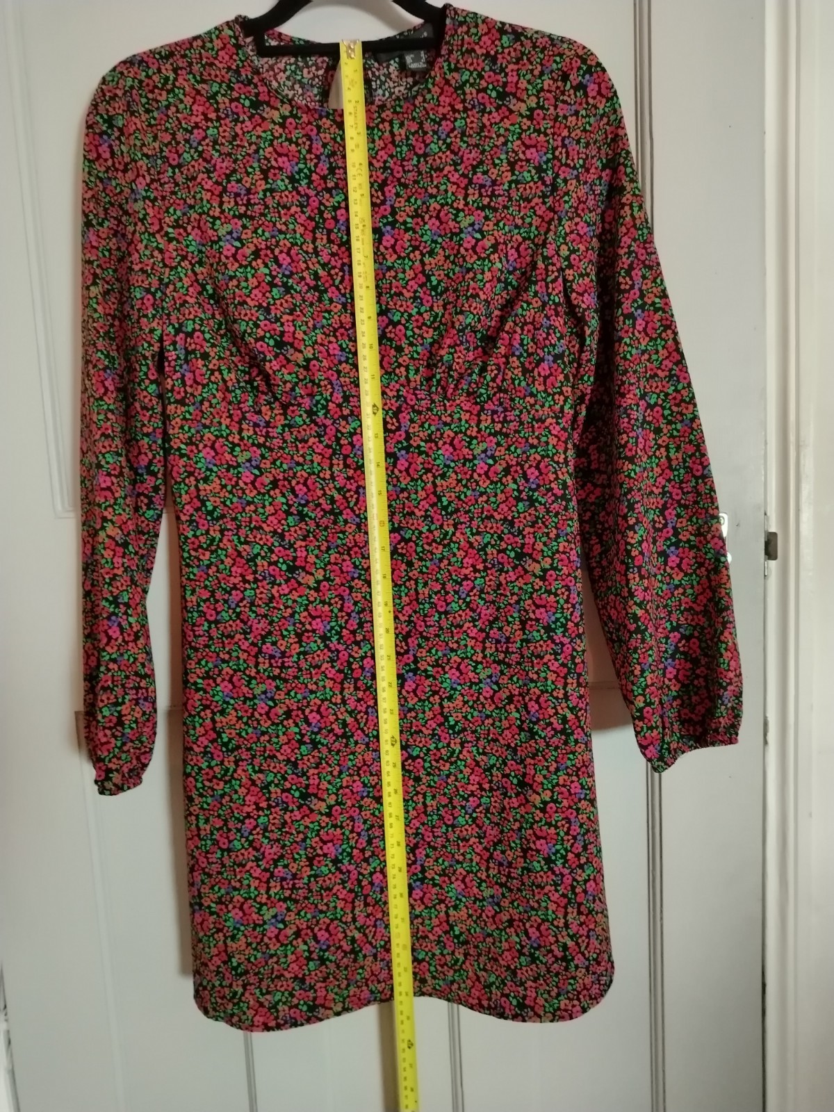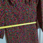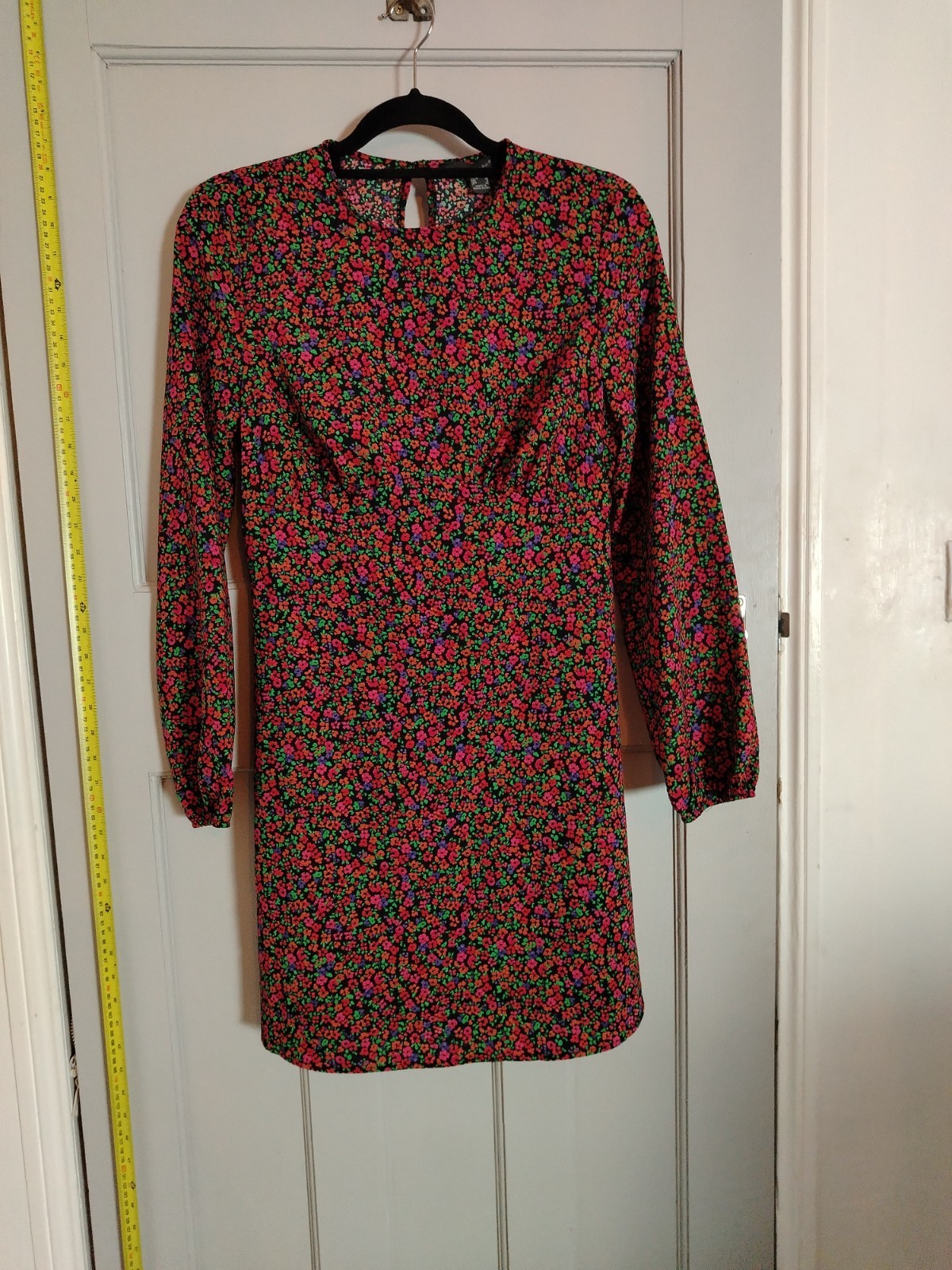 A versatile long-sleeved mini dress by Primark featuring a vibrant multi-coloured ditsy floral print on a black background. The dress features a round neckline, gathered empire waist detail, and a keyhole button fastening at the back. Ideal for casual wear or work.