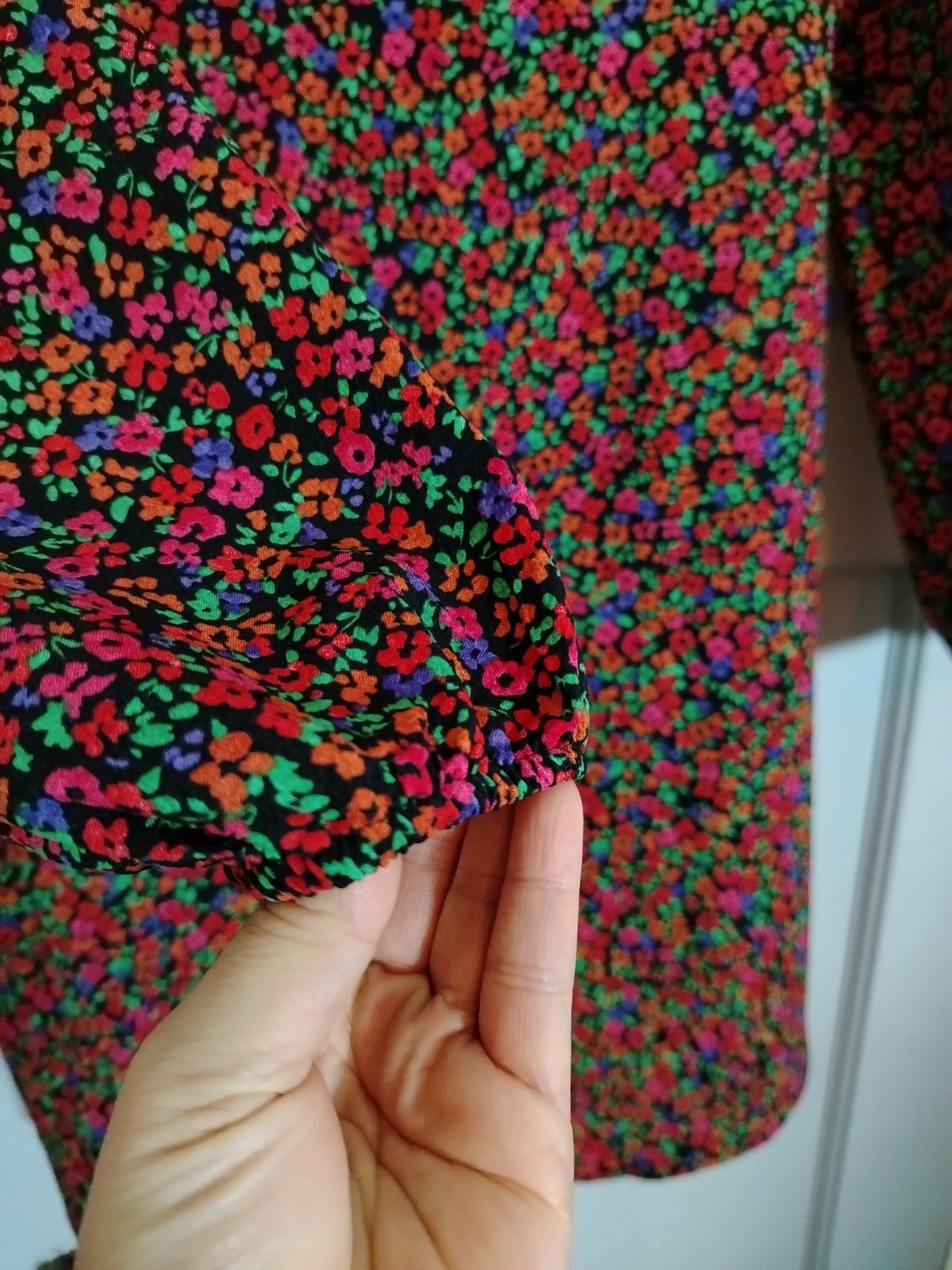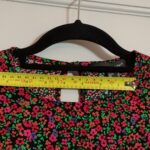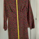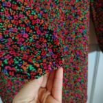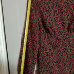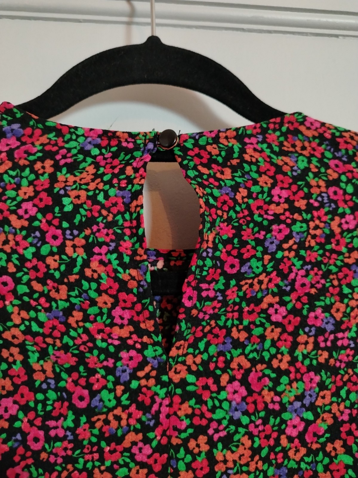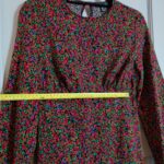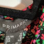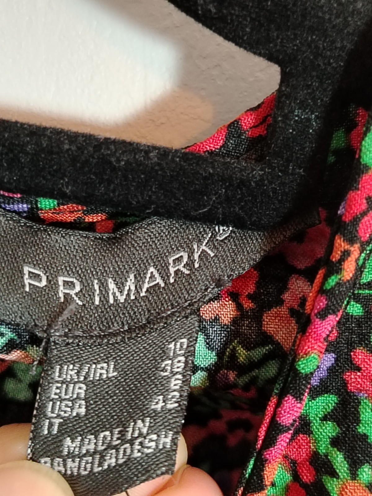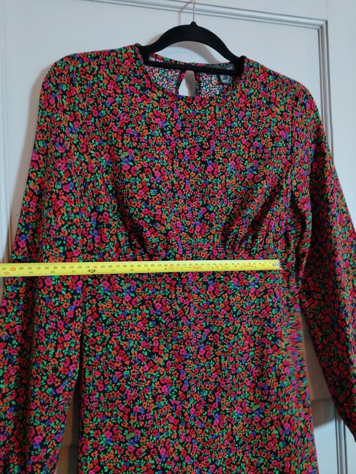 A versatile long-sleeved mini dress by Primark featuring a vibrant multi-coloured ditsy floral print on a black background. The dress features a round neckline, gathered empire waist detail, and a keyhole button fastening at the back. Ideal for casual wear or work.