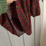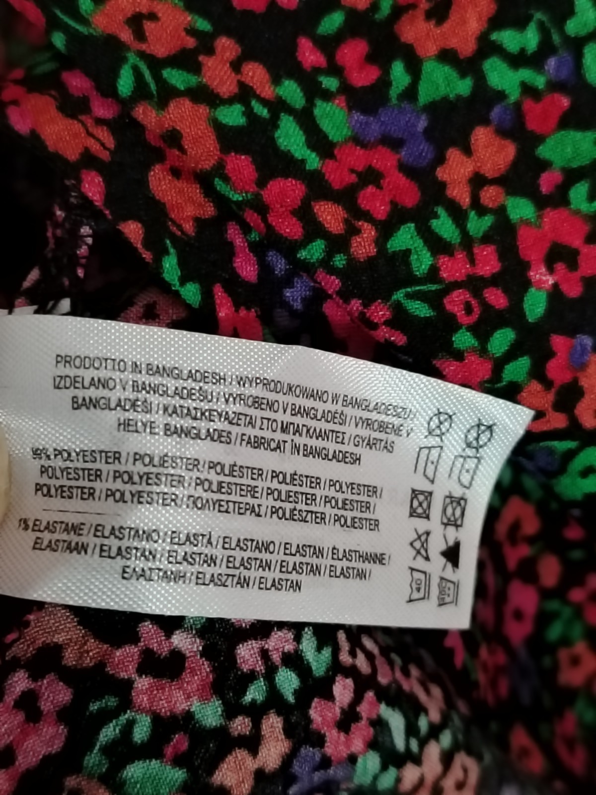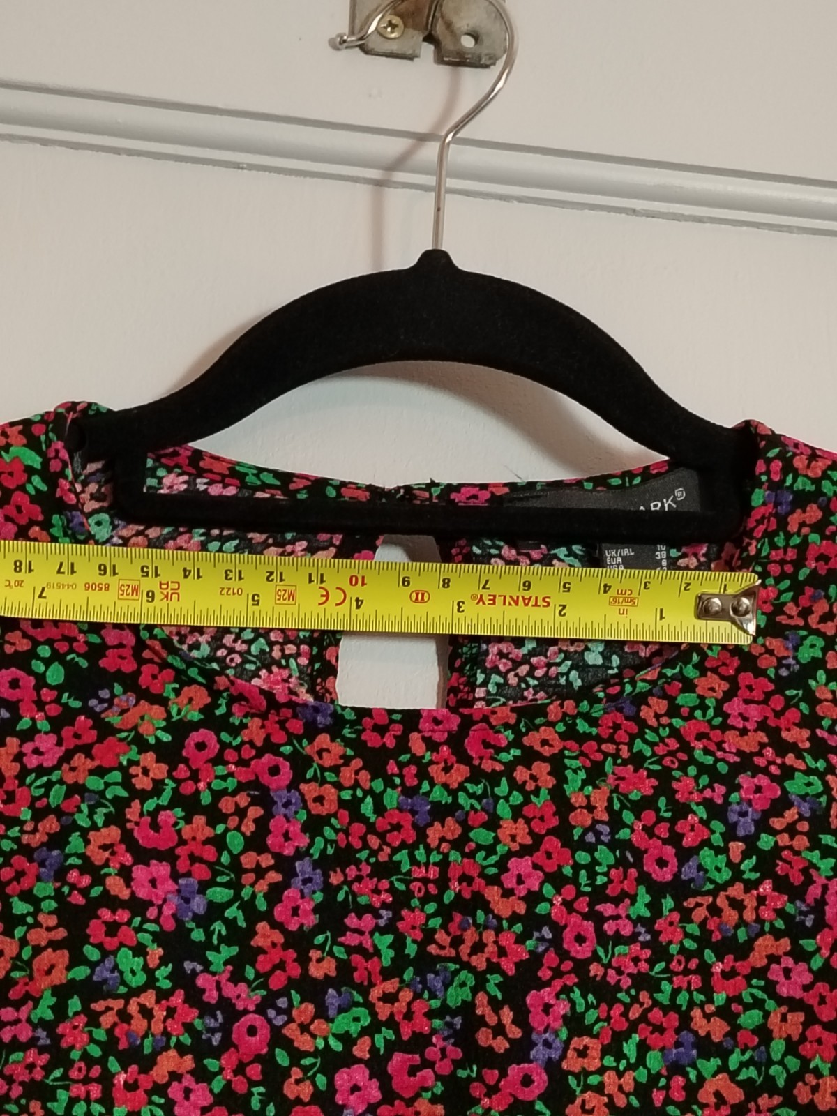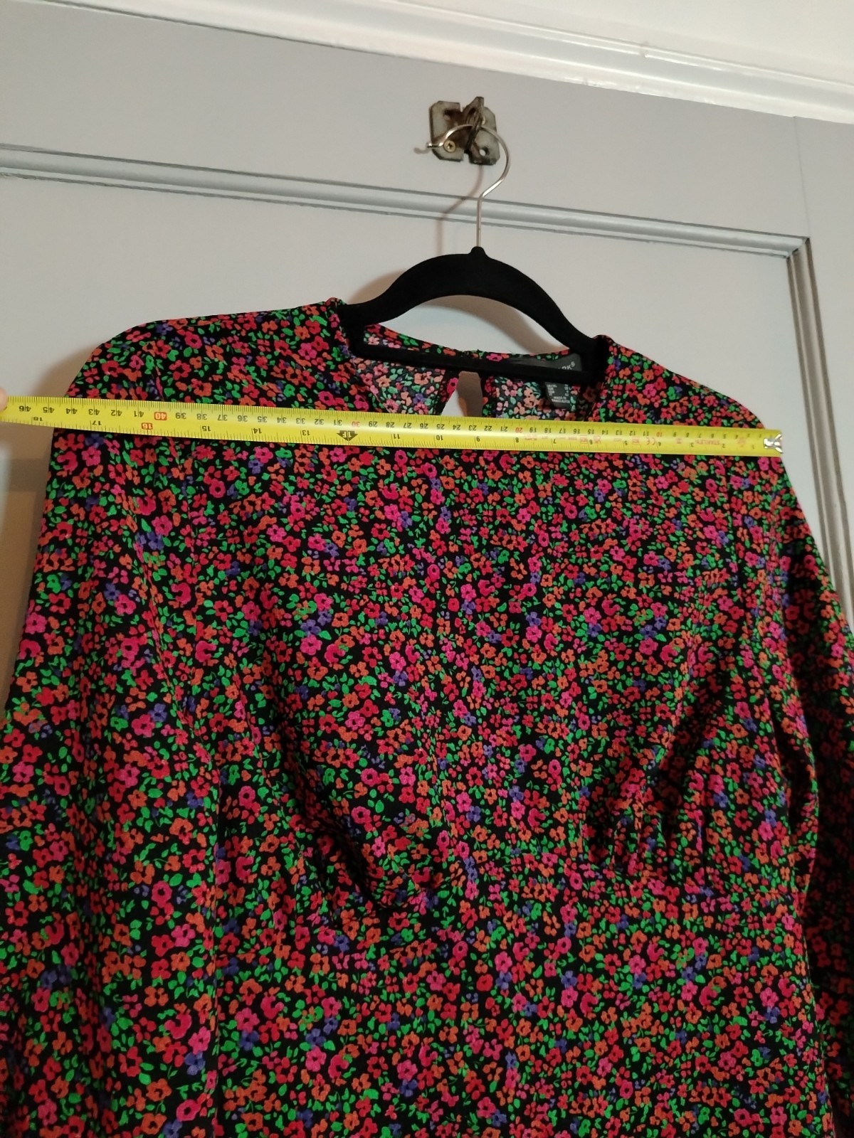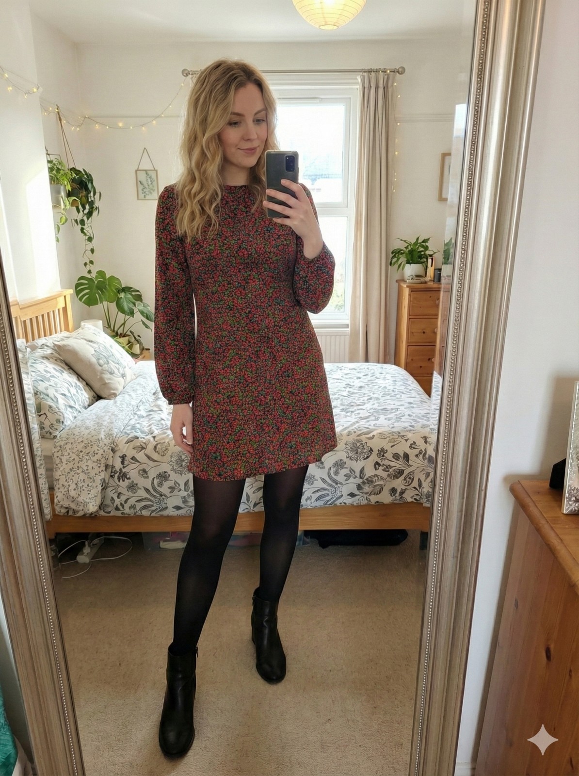 A versatile long-sleeved mini dress by Primark featuring a vibrant multi-coloured ditsy floral print on a black background. The dress features a round neckline, gathered empire waist detail, and a keyhole button fastening at the back. Ideal for casual wear or work.