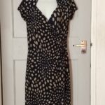 Features: Faux-wrap style with gathered side and decorative buckle, V-neck, short sleeves, knee-length silhouette