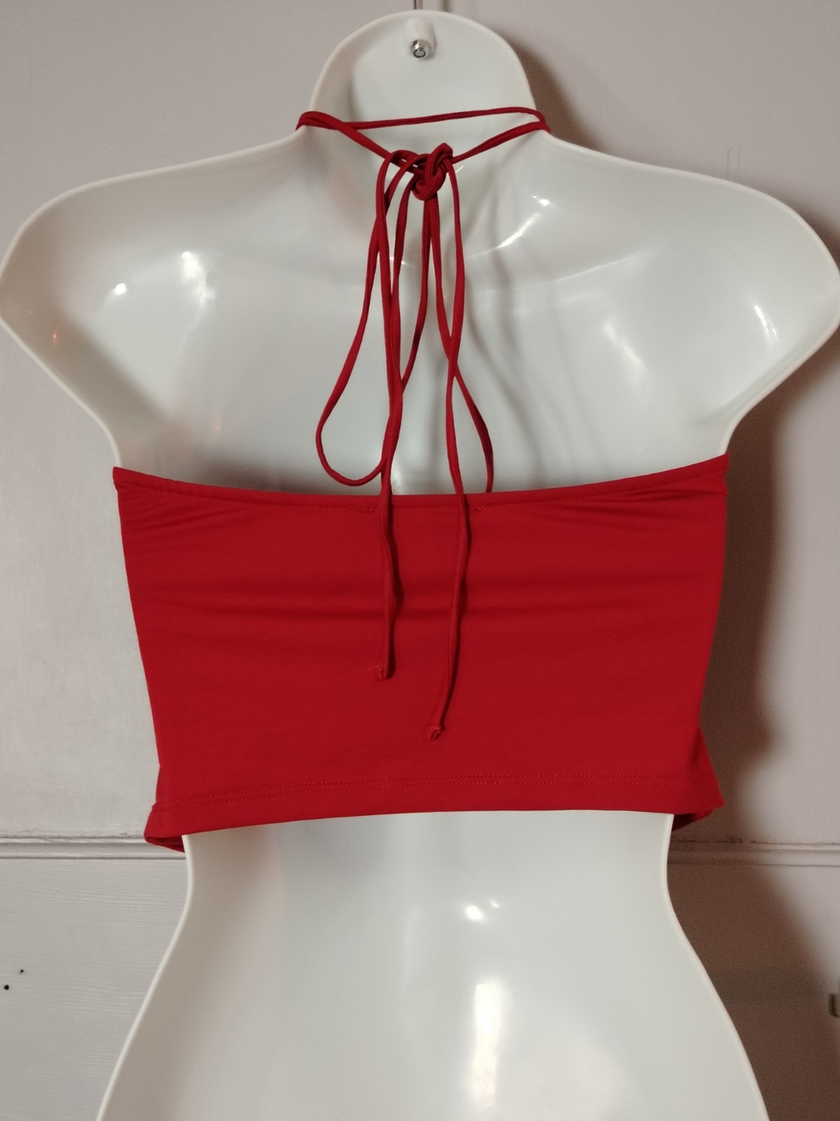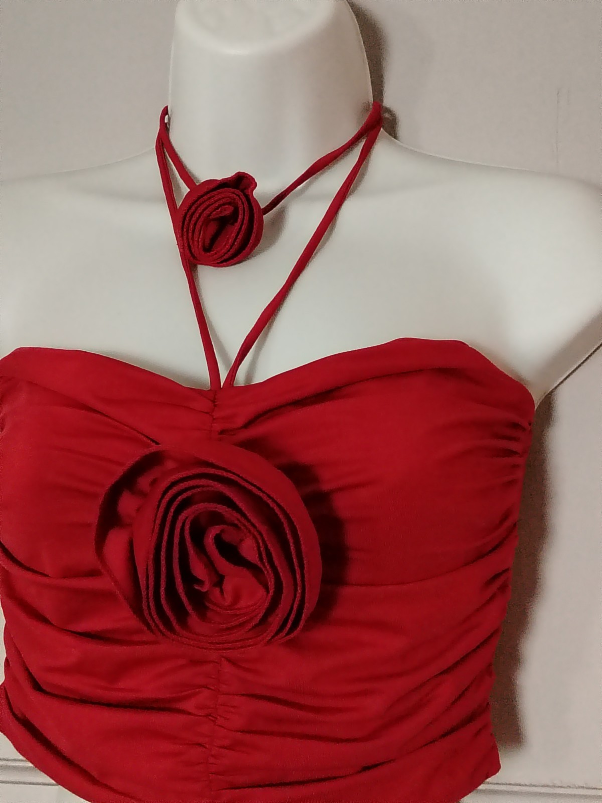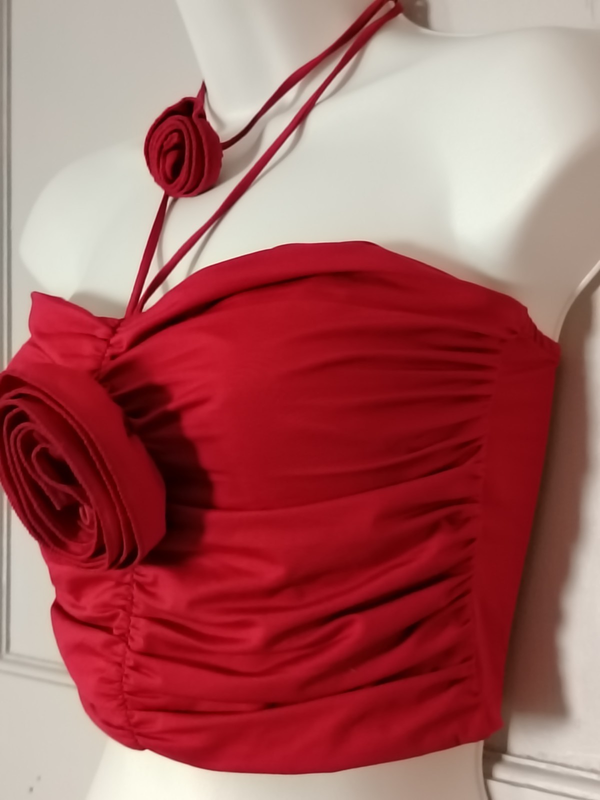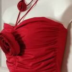 Stand out with this vibrant red statement piece from Pull&Bear. Featuring a highly sought-after Y2K-inspired design, this top combines a ruched bandeau-style body with a stunning 3D rosette appliqué on the front. It ties at the back of the neck via thin halter straps, complete with a matching smaller 3D rose choker detail.