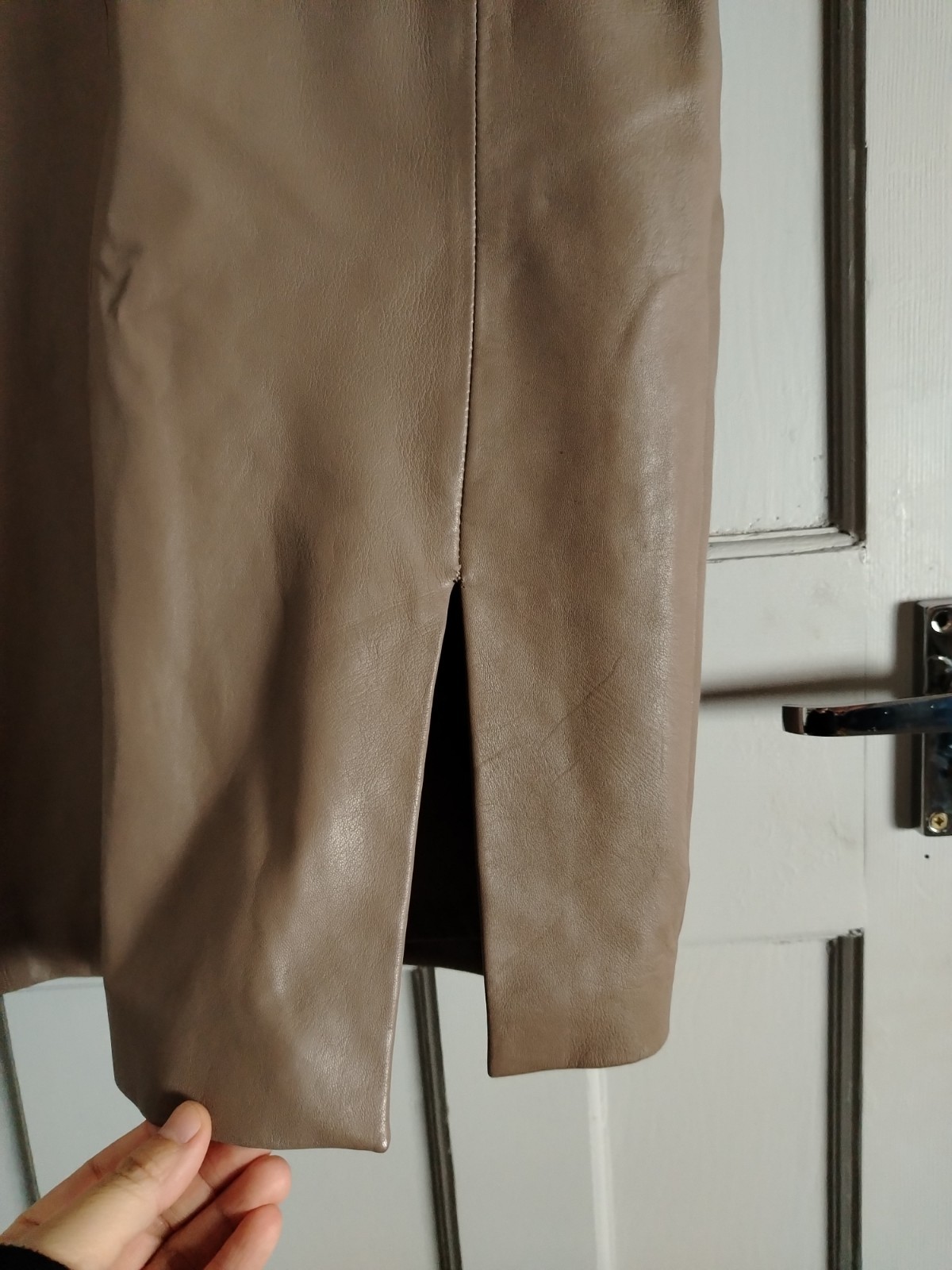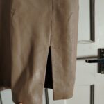 Elevate your professional or evening wardrobe with this stunning REISS pencil skirt. Crafted from premium, buttery-soft lamb leather in a versatile taupe/mushroom shade, this piece features elegant panelled stitching and a chic front-side slit.