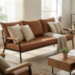 Design: A sturdy black metal frame provides an industrial edge, softened by warm brown upholstery and stylish wooden accents on the armrests.