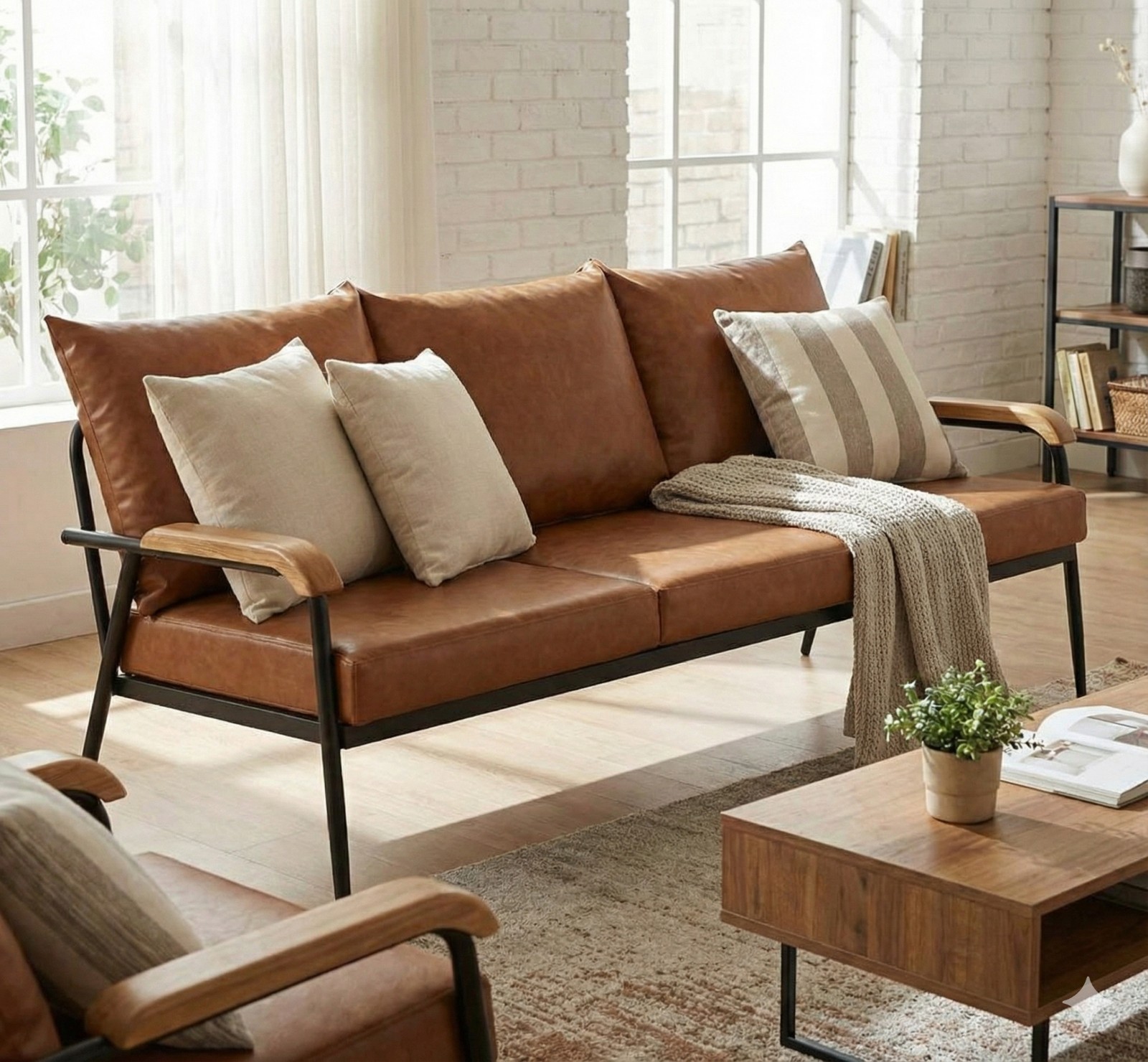 Add a touch of loft-style elegance to your living room, office, or waiting area with this stunning industrial-style sofa. Combining a sleek black metal frame with warm, cognac-brown faux leather, this piece fits perfectly with modern, vintage, or minimalist decor.