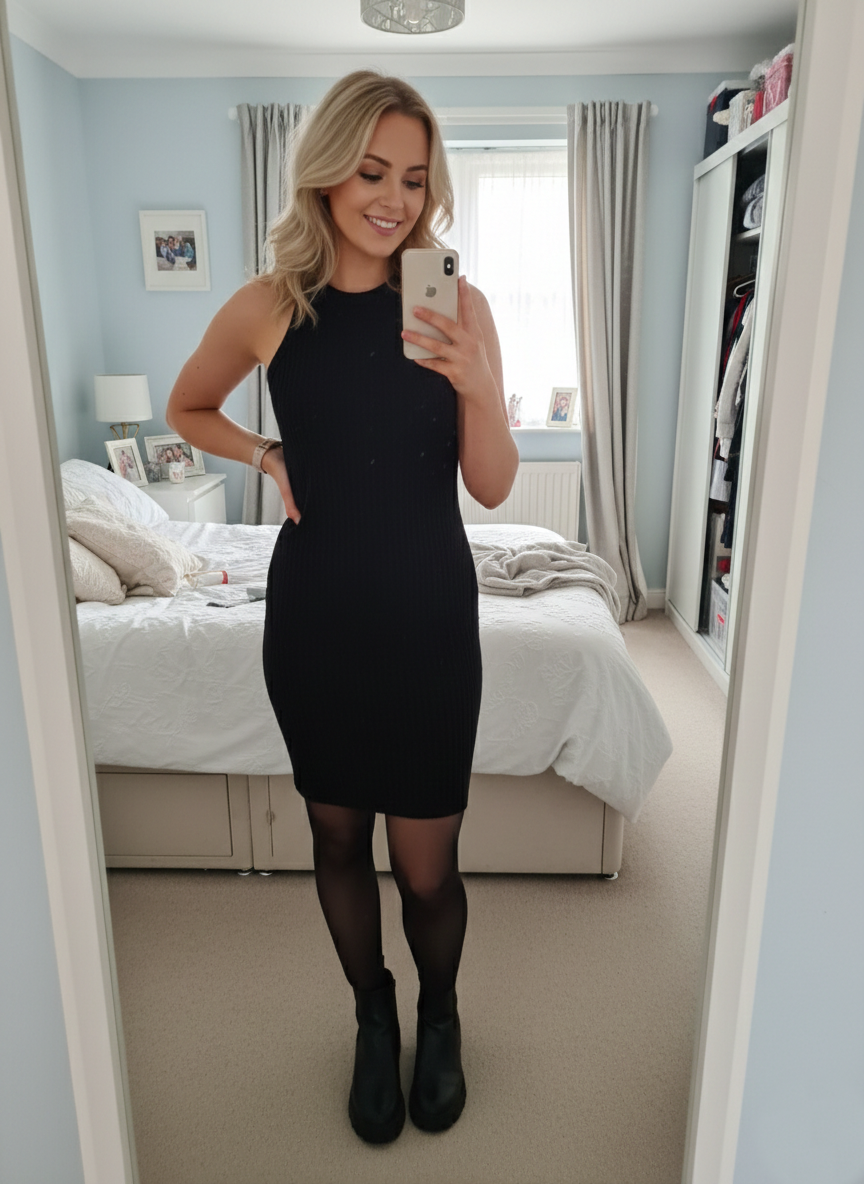 This versatile dress features a high-neck, racerback style in a stretchy ribbed fabric that hugs the figure beautifully. It is a midi length, perfect for pairing with trainers for a casual day look or heels for a night out. A classic Little Black Dress (LBD) essential for any wardrobe.