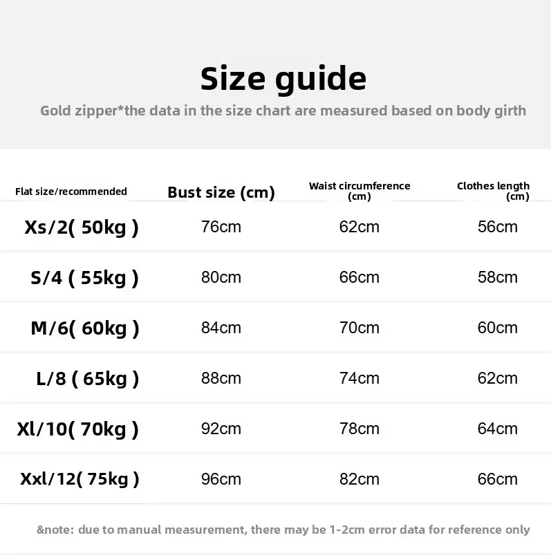 XXL-size 10 62.50k, XXXL-size 12 67.50k, L-size 6 52.50kg -5, XL-size 8 57.50kg -6, S-size 2 42.50kg -4, M-Size 4 47.50kg -5