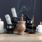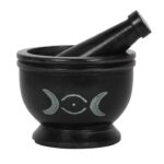 This carved soap stone mortar and pestle is an essential tool for crushing and grinding herbs in a variety of sacred rituals. This style is accented by a carved triple moon design on the side and is great for display or a witch’s kitchen.Product Dimensions: H9cm x W9cm x D9cm Packaged Dimensions: H14cm x W11.5cm x D11.5cm