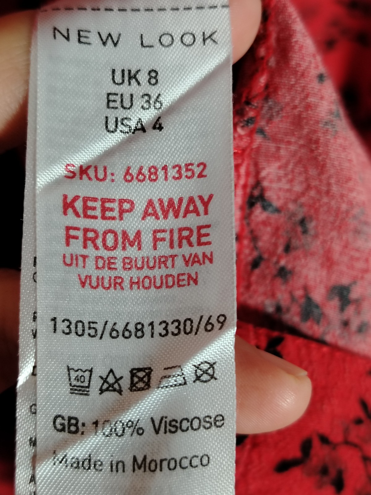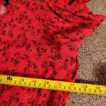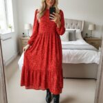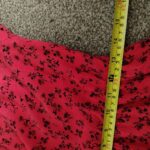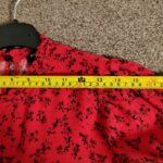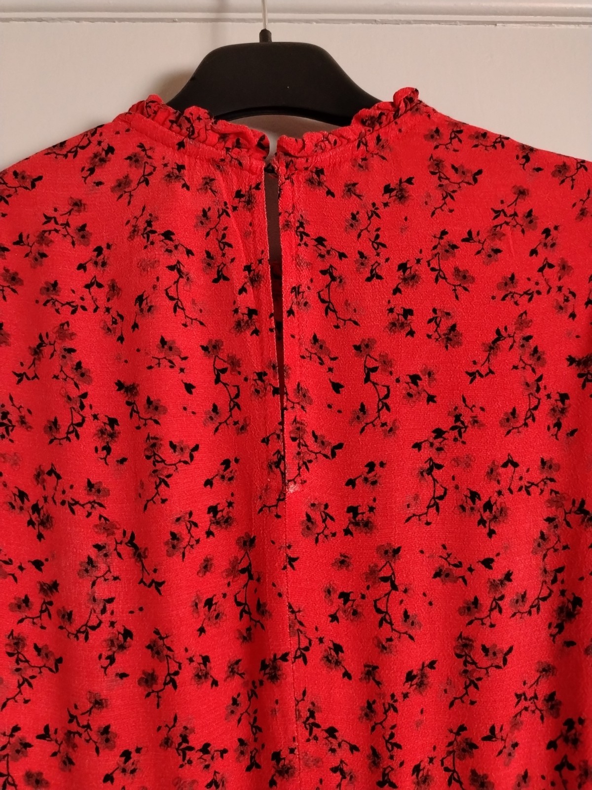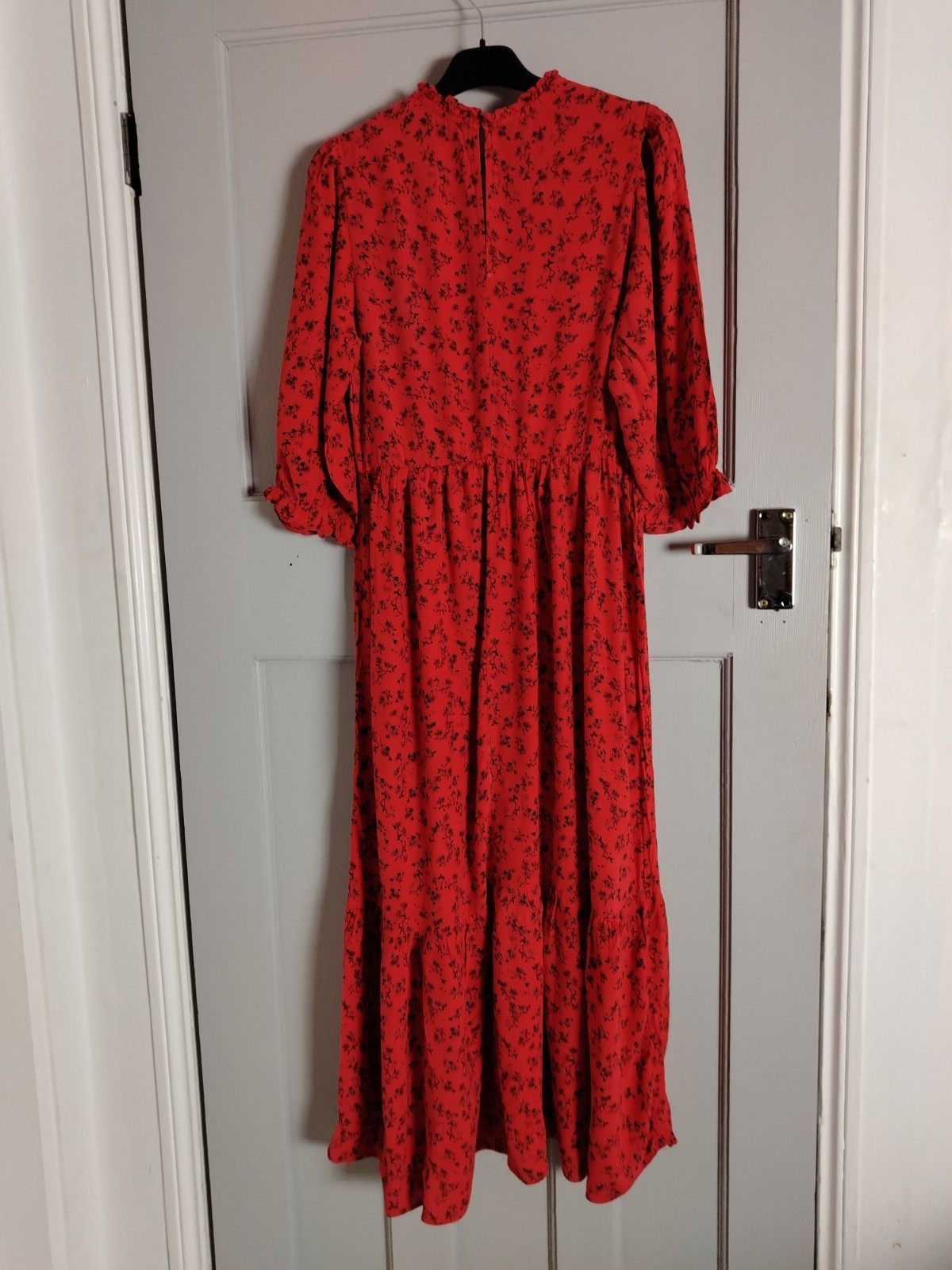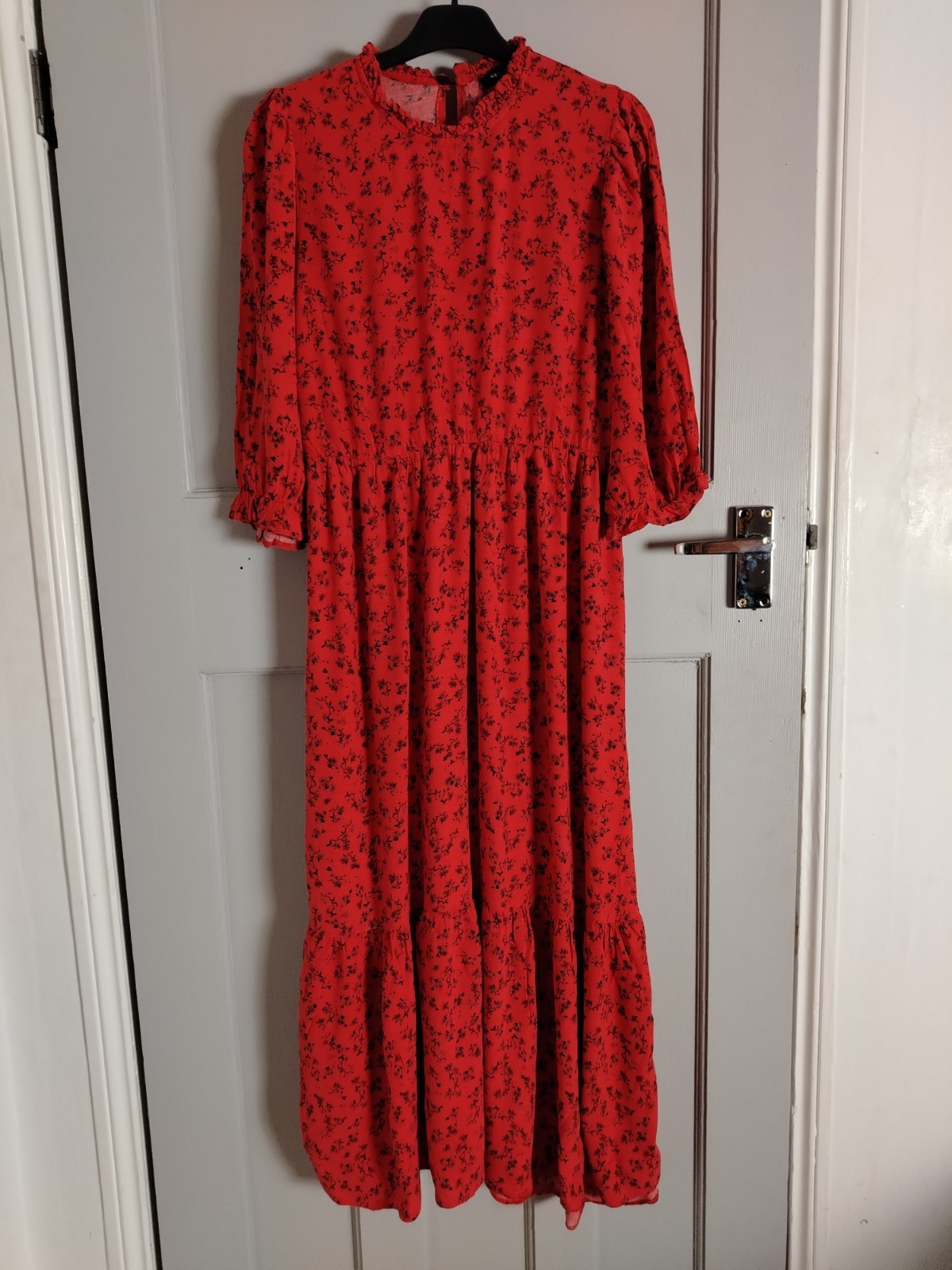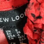 PRODUCT ANALYSISItem OverviewType: Long-sleeved, tiered maxi/midi dress with a high frill neck and elasticated cuffs.Style: Smock/Tiered boho style.Colour/Pattern: Red with a black floral/sprig print.Fabric & MaterialLabelled: 100% Viscose.Texture: Lightweight, woven fabric with a slight crinkle texture typical of viscose.BrandNew Look.Size (UK – Women)Labelled: UK 8 (EU 36 / USA 4).Measurements (Approximate):Chest (Pit-to-pit): ~16 inches (40 cm).Waist (Elasticated): ~13 inches (33 cm) unstretched.Length: ~47-48 inches (120 cm).ConditionFair condition (Due to visible staining/discolouration).Flaws / NotesThere is a visible pale stain/discolouration mark on the fabric (shown in detail in image).The fabric shows general signs of being pre-owned but remains structurally sound.SuitabilitySpares or Repairs / Upcycling: Due to the visible stain, this item is best suited for someone comfortable with stain removal techniques, or for upcycling/craft projects. It is a beautiful garment and far too good for a landfill.