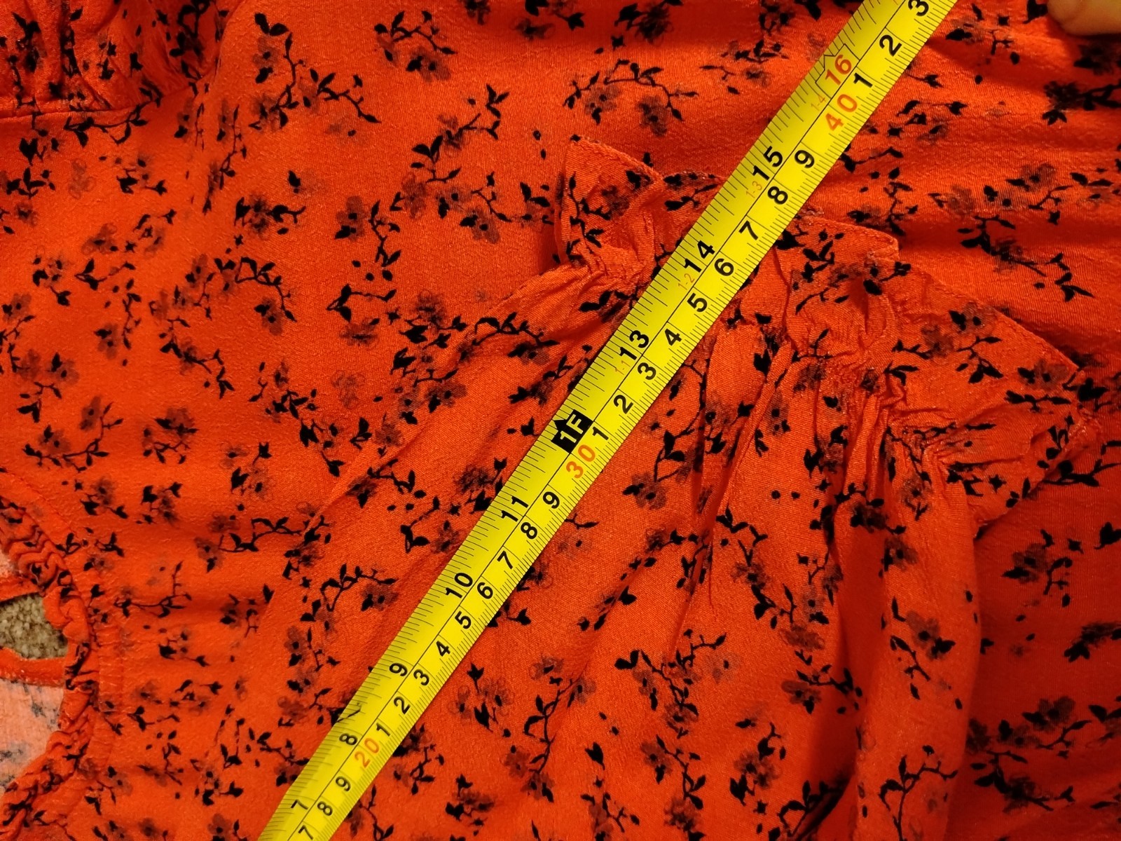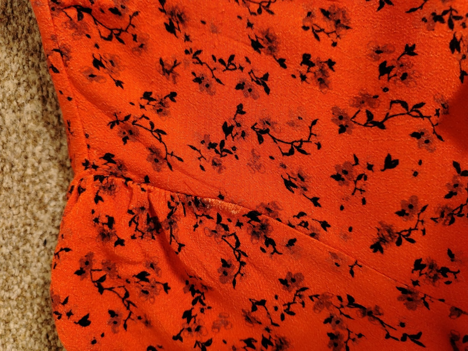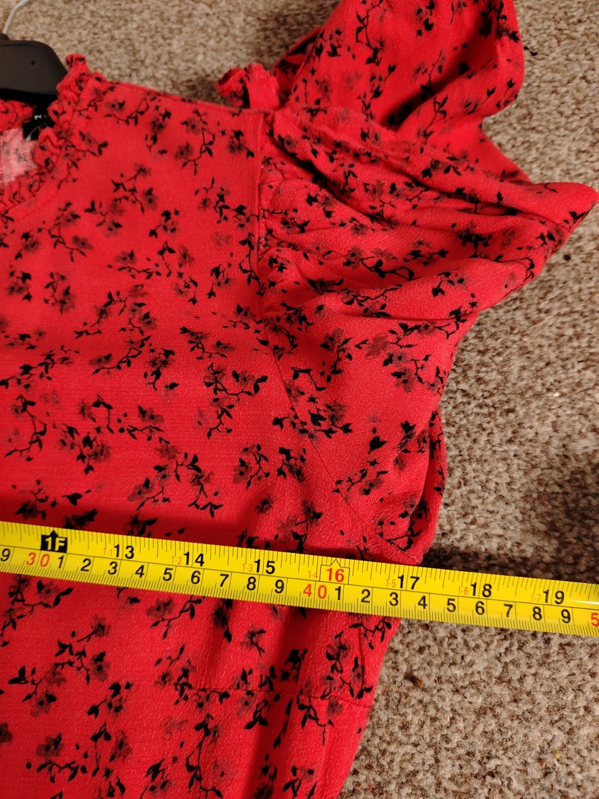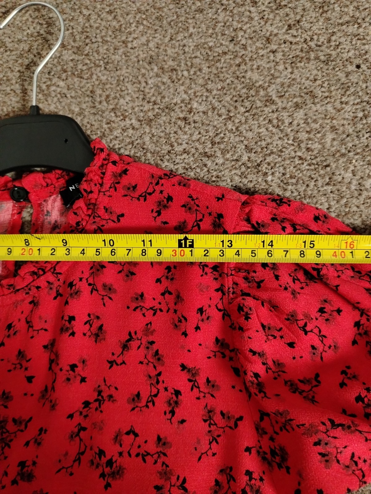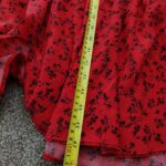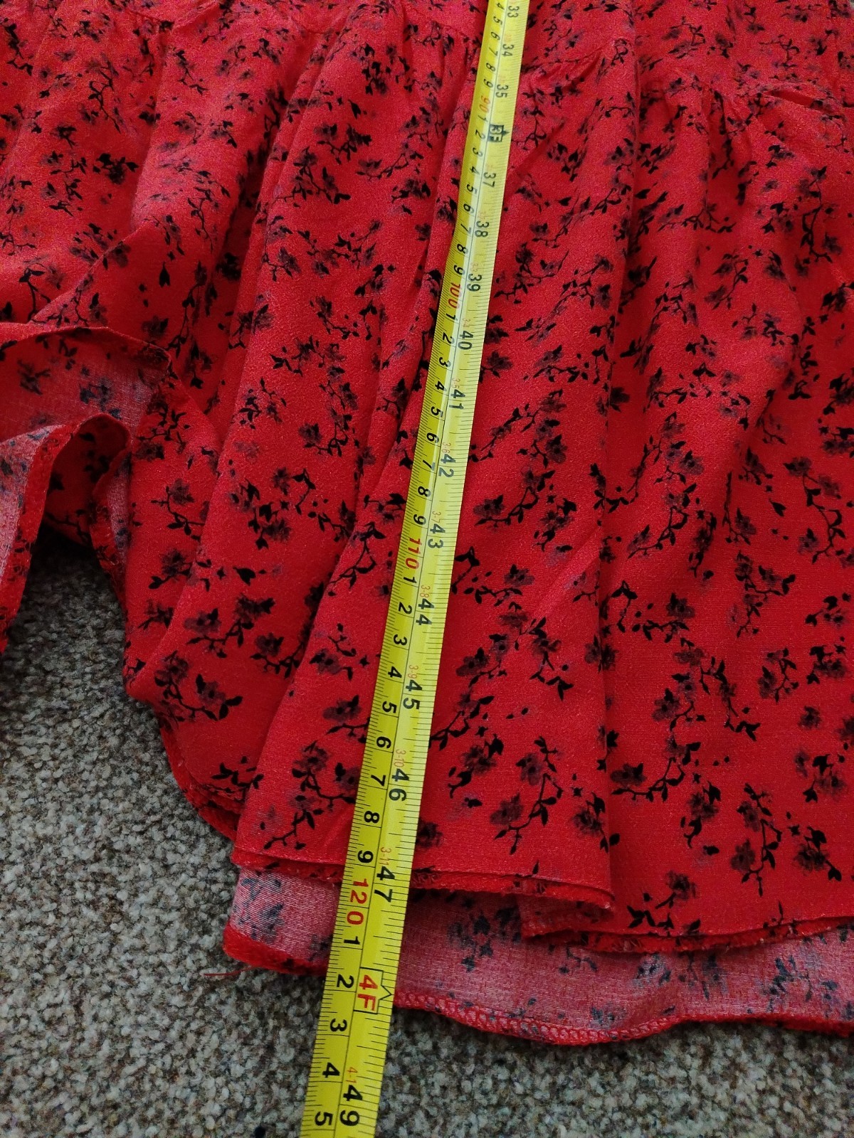 PRODUCT ANALYSISItem OverviewType: Long-sleeved, tiered maxi/midi dress with a high frill neck and elasticated cuffs.Style: Smock/Tiered boho style.Colour/Pattern: Red with a black floral/sprig print.Fabric & MaterialLabelled: 100% Viscose.Texture: Lightweight, woven fabric with a slight crinkle texture typical of viscose.BrandNew Look.Size (UK – Women)Labelled: UK 8 (EU 36 / USA 4).Measurements (Approximate):Chest (Pit-to-pit): ~16 inches (40 cm).Waist (Elasticated): ~13 inches (33 cm) unstretched.Length: ~47-48 inches (120 cm).ConditionFair condition (Due to visible staining/discolouration).Flaws / NotesThere is a visible pale stain/discolouration mark on the fabric (shown in detail in image).The fabric shows general signs of being pre-owned but remains structurally sound.SuitabilitySpares or Repairs / Upcycling: Due to the visible stain, this item is best suited for someone comfortable with stain removal techniques, or for upcycling/craft projects. It is a beautiful garment and far too good for a landfill.