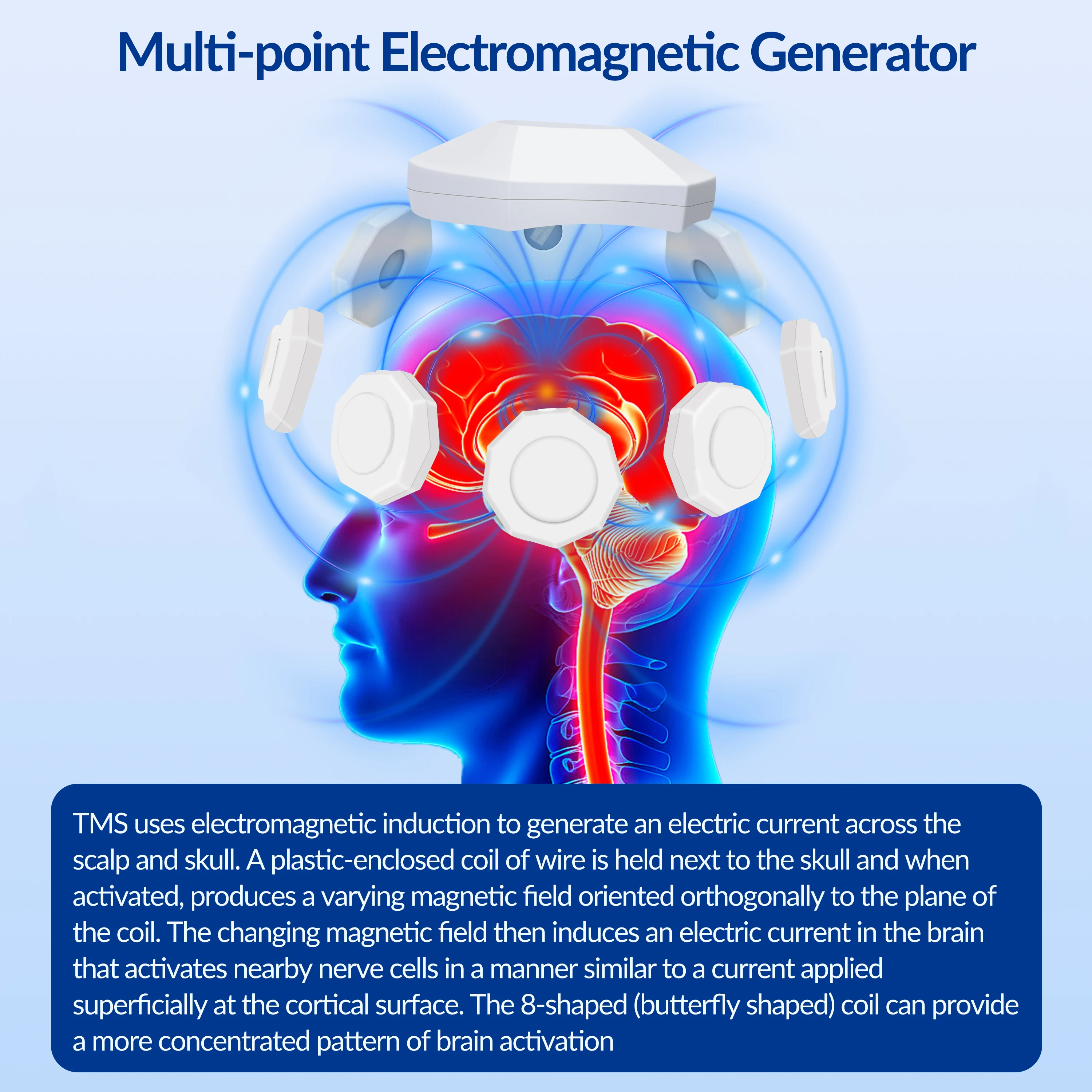 Transcranial Magnetic Stimulation TMS refers to the use of pulsed magnetic fields of different frequencies that pass through the skull and act on corresponding brain functional areas to improve areas of high or low brain function. TMS is a treatment method that uses magnetic fields to alter brain activity. As the brain’s nerve cells transmit signals through electrical currents, action potentials can be generated to transmit the information to the next brain cell, thereby activating the entire neural circuit.