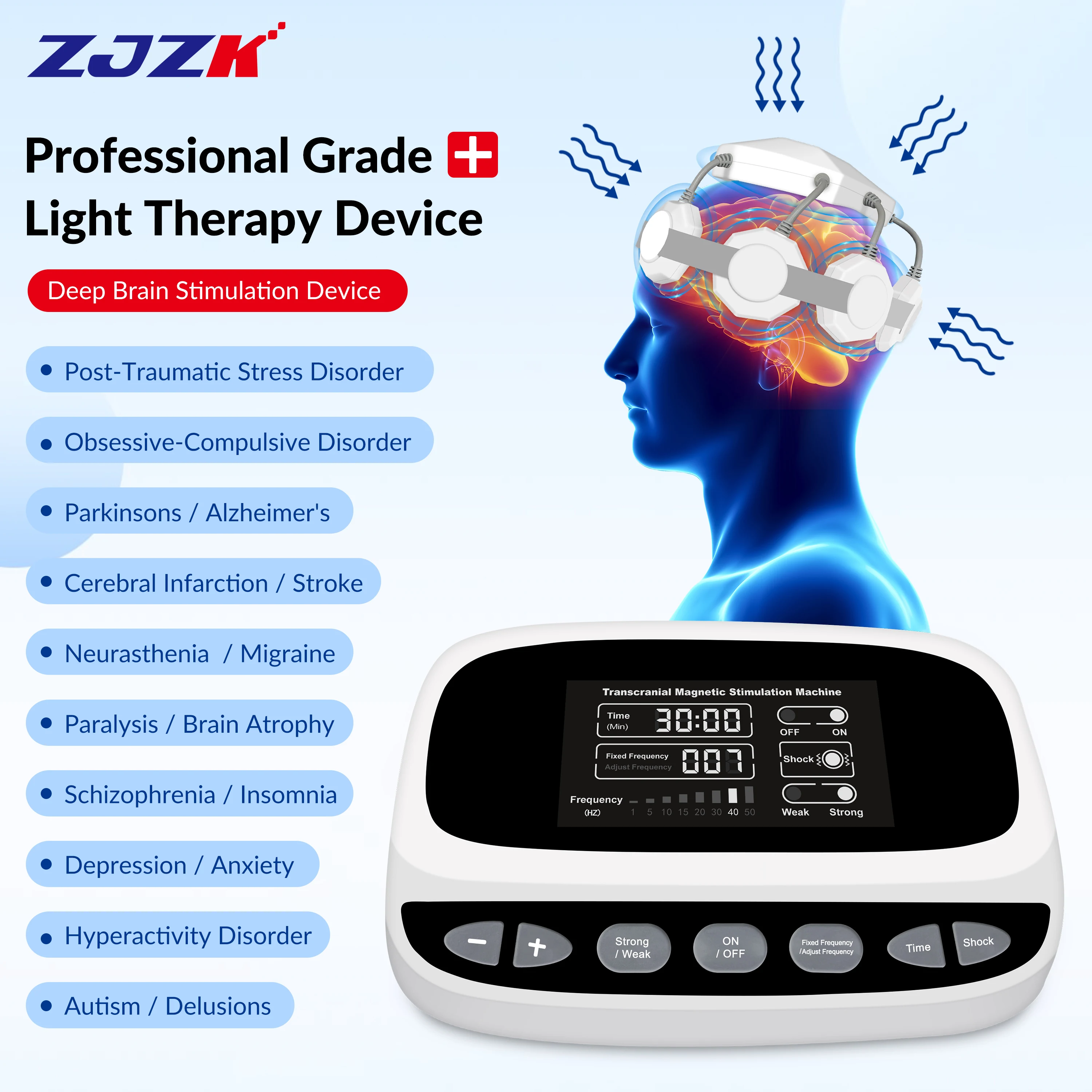 【 Principle 】Transcranial magnetic treatment mainly achieves therapeutic goals through different frequencies, with High frequency rTMS >1Hz: increases cortical excitability.Low frequency rTMS ≤ 1Hz: reduces cortical excitability. This tms transcranial has 8 fixed frequency modes: 1/5/10/15/30/40/50Hz, adjustable. The tms therapeutics device also has weak mode and strong mode. Weak mode: 3mT-15mT maximum peak: 15mT, Strong mode: 15mT-30mT maximum peak: 30mT.