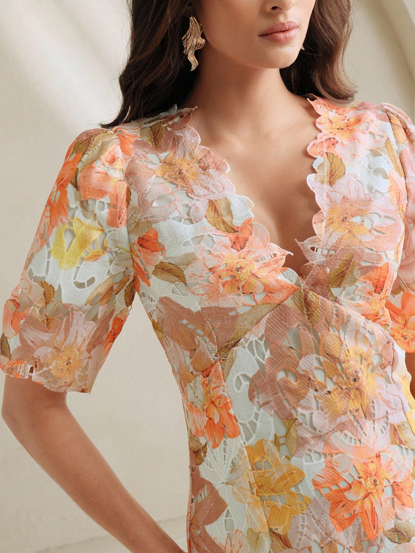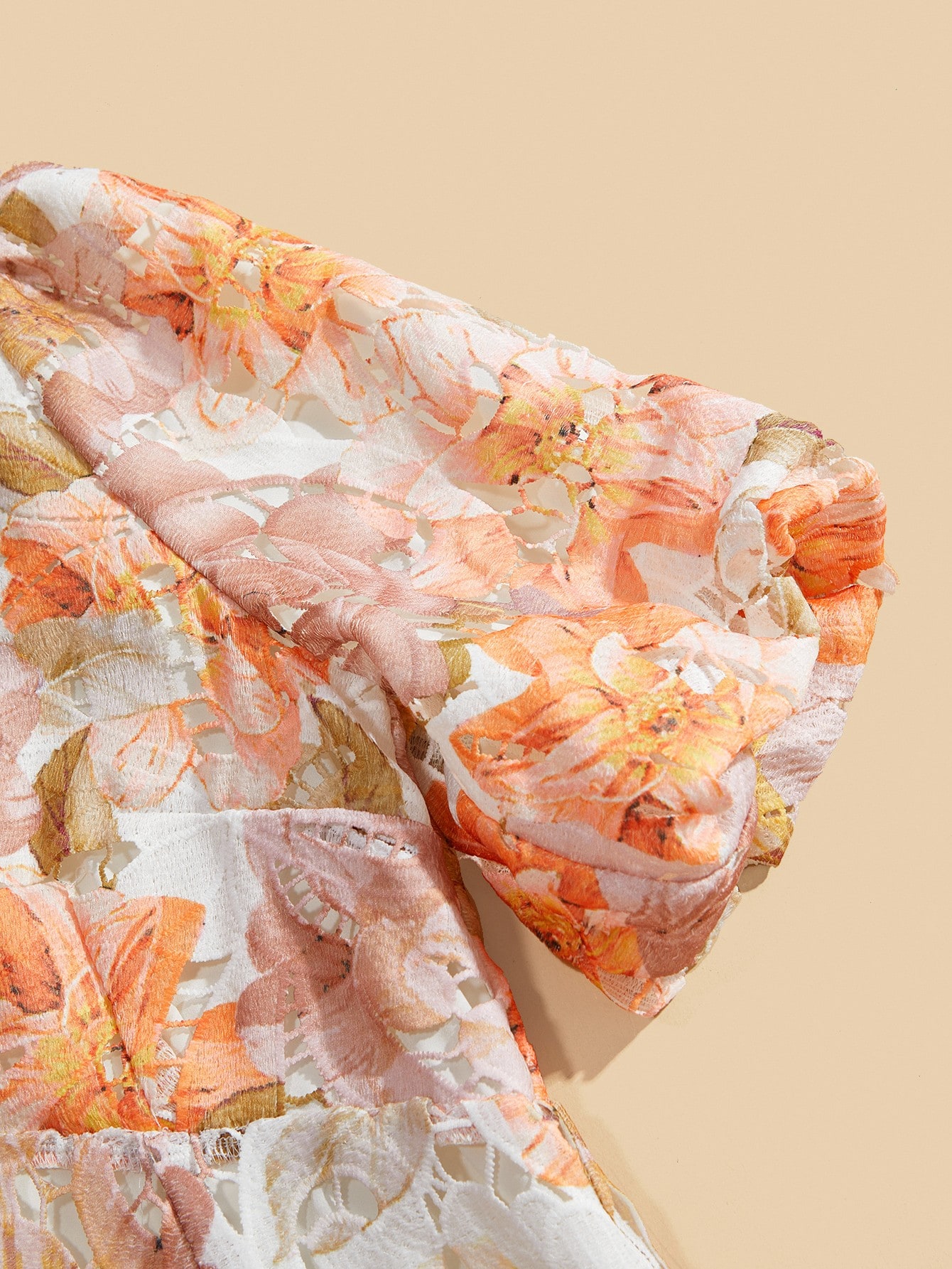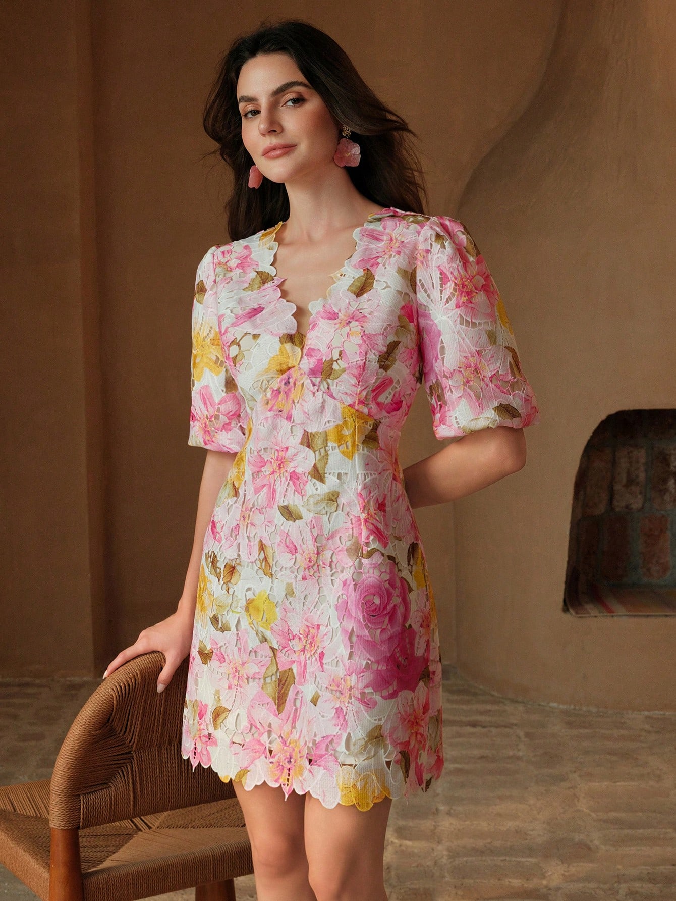 Women V-Neck Short Puff Sleeve Ruffled A-Line Lace Floral Print Dress, Summer, Festival, Holiday, Vacation, Elegant